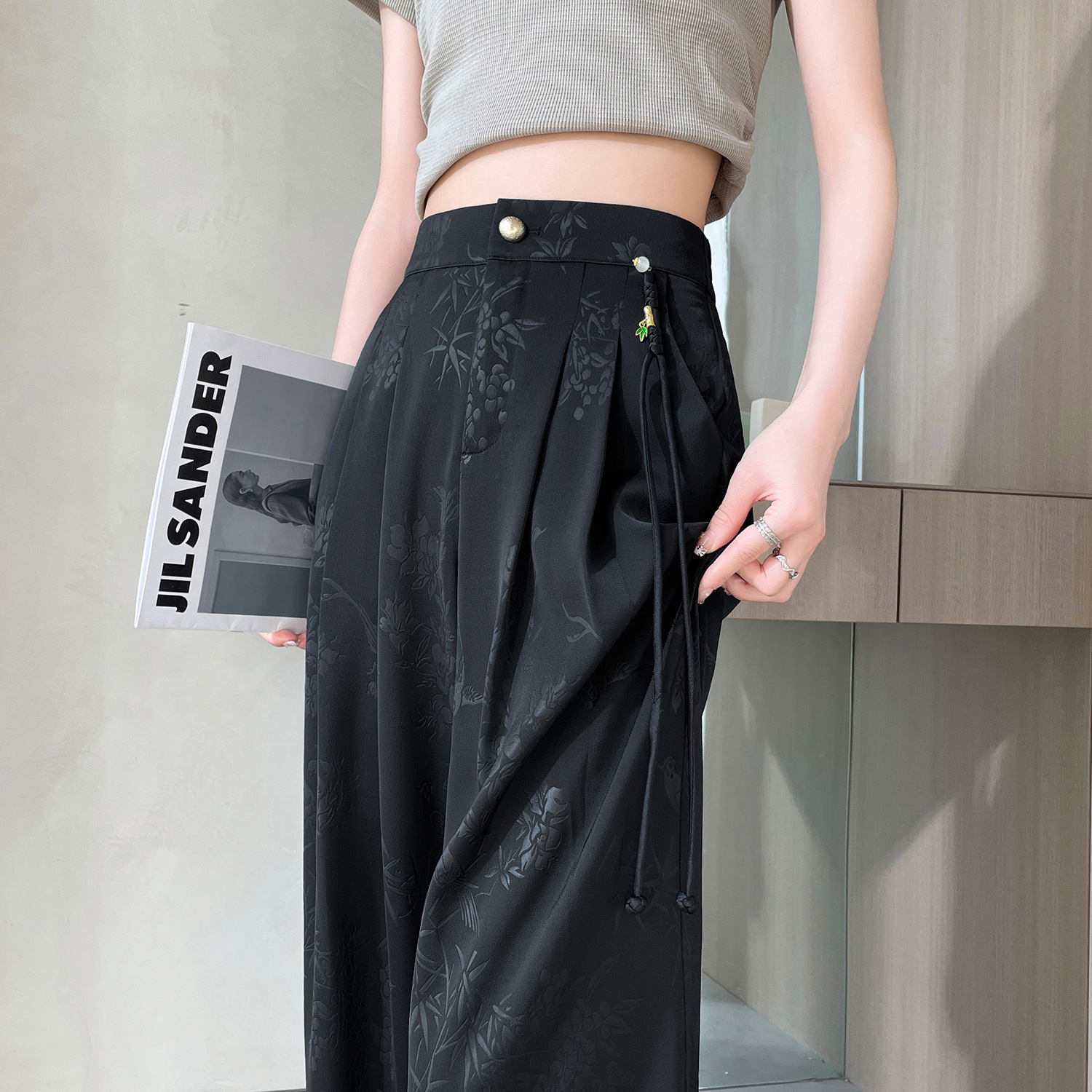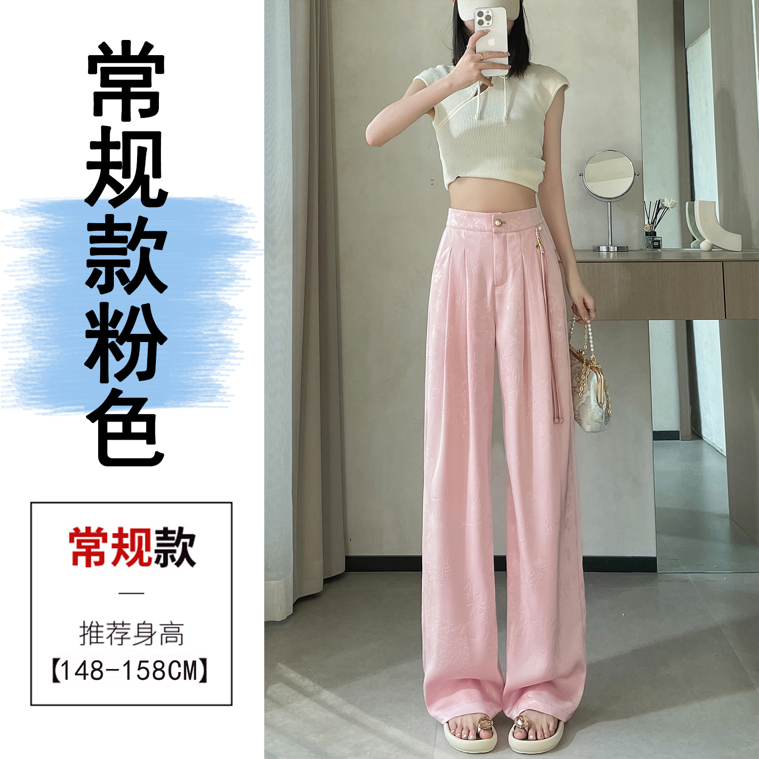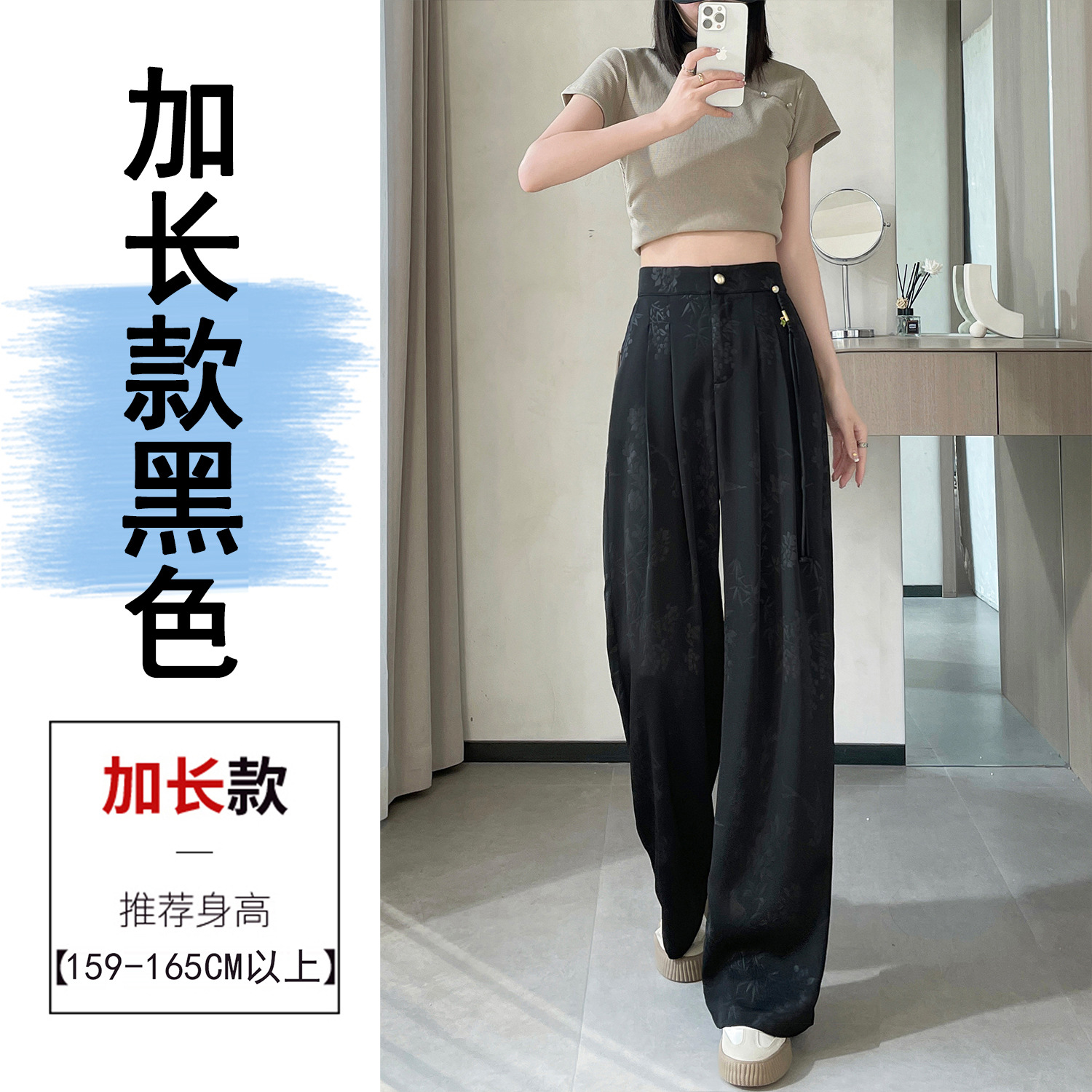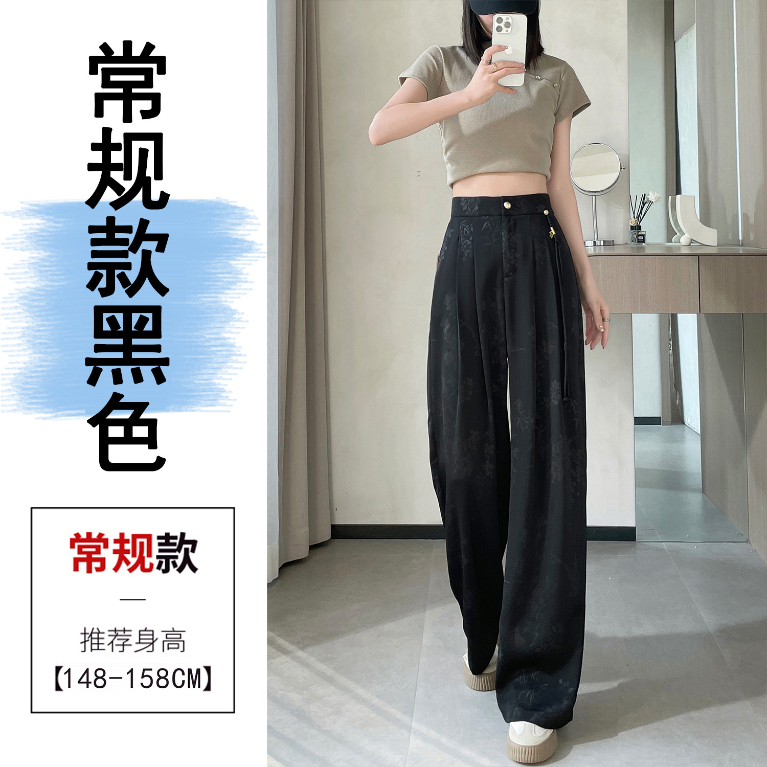新中式国风提花缎面阔腿裤女夏季冰丝小个子窄版醋酸垂坠感直筒裤