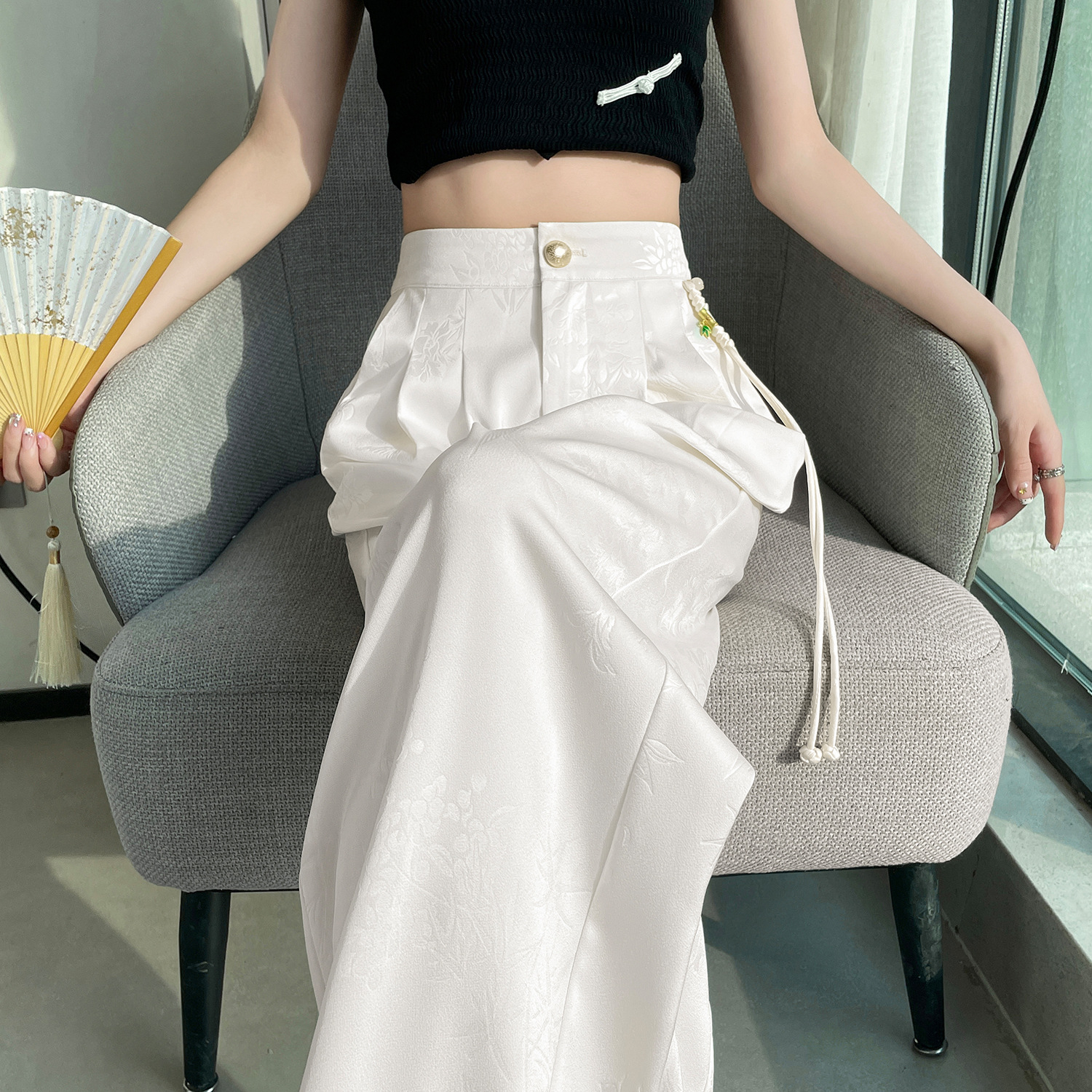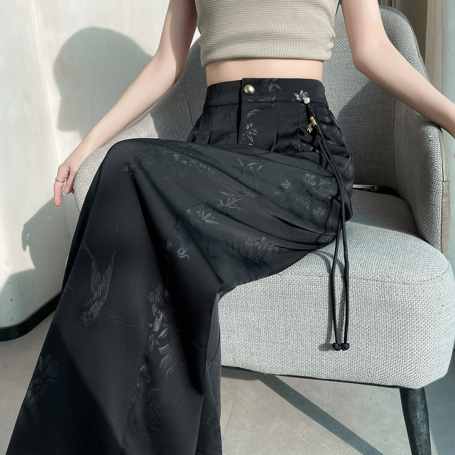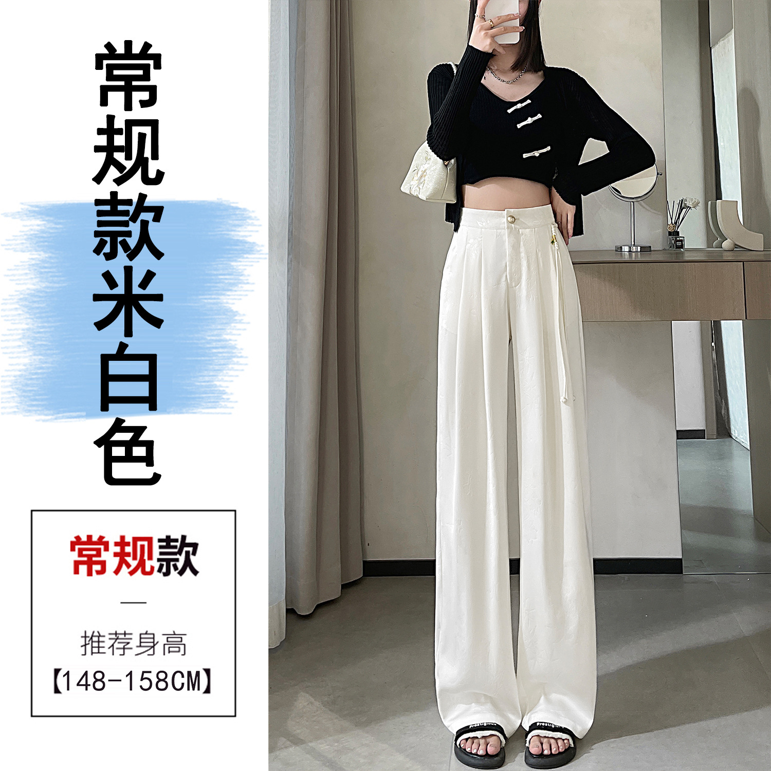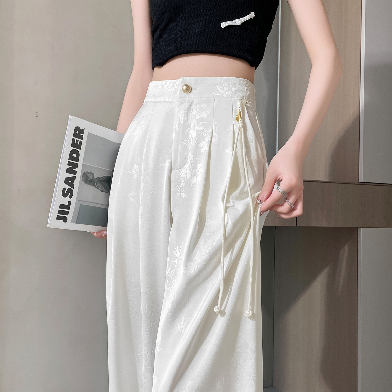 新中式国风提花缎面阔腿裤女夏季冰丝小个子窄版醋酸垂坠感直筒裤
