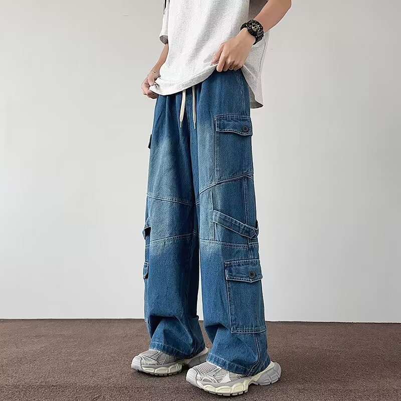 美式嘻哈工装牛仔裤男hiphop潮牌高街多口袋宽松坠感阔腿拖地长裤