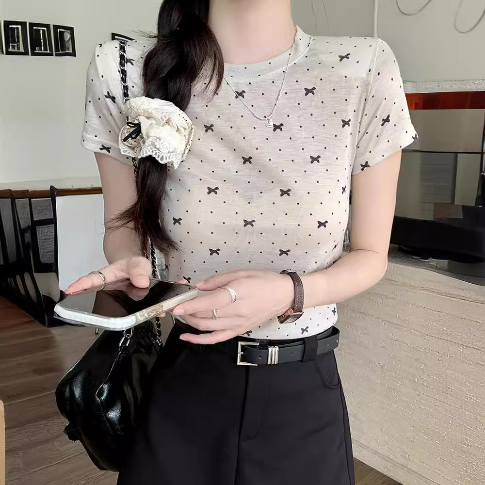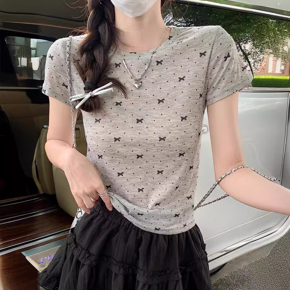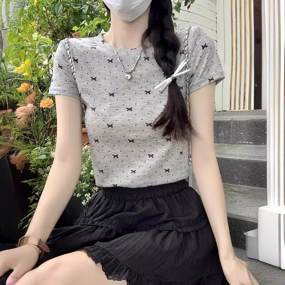 蝴蝶结印花甜美气质短袖圆领T恤短款修身夏季新款小个子女装