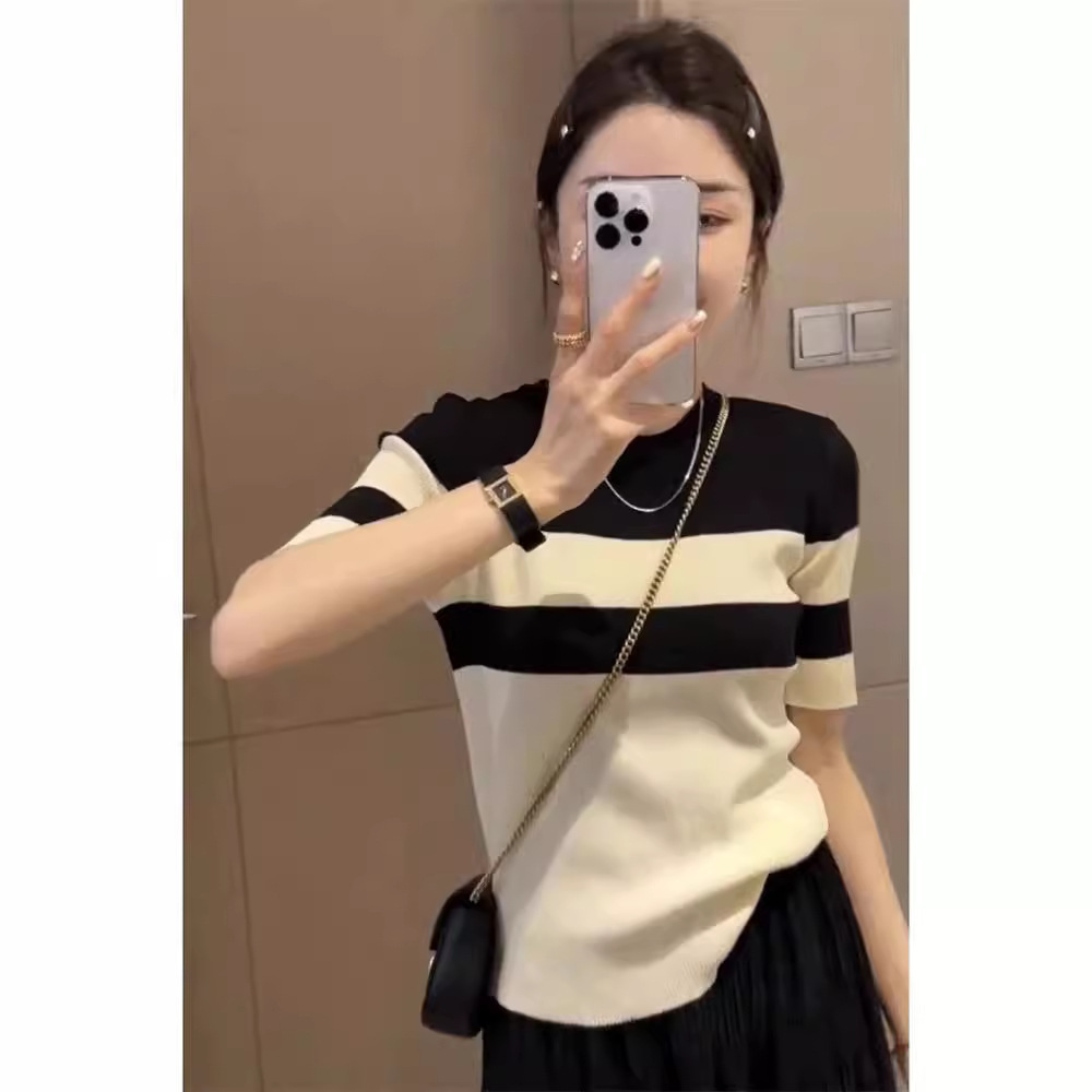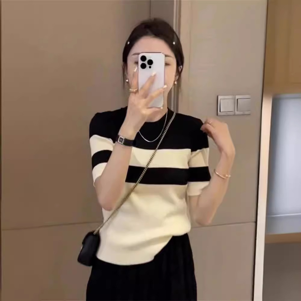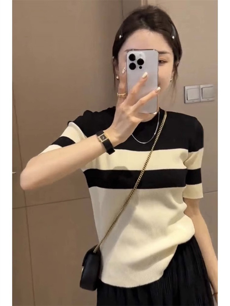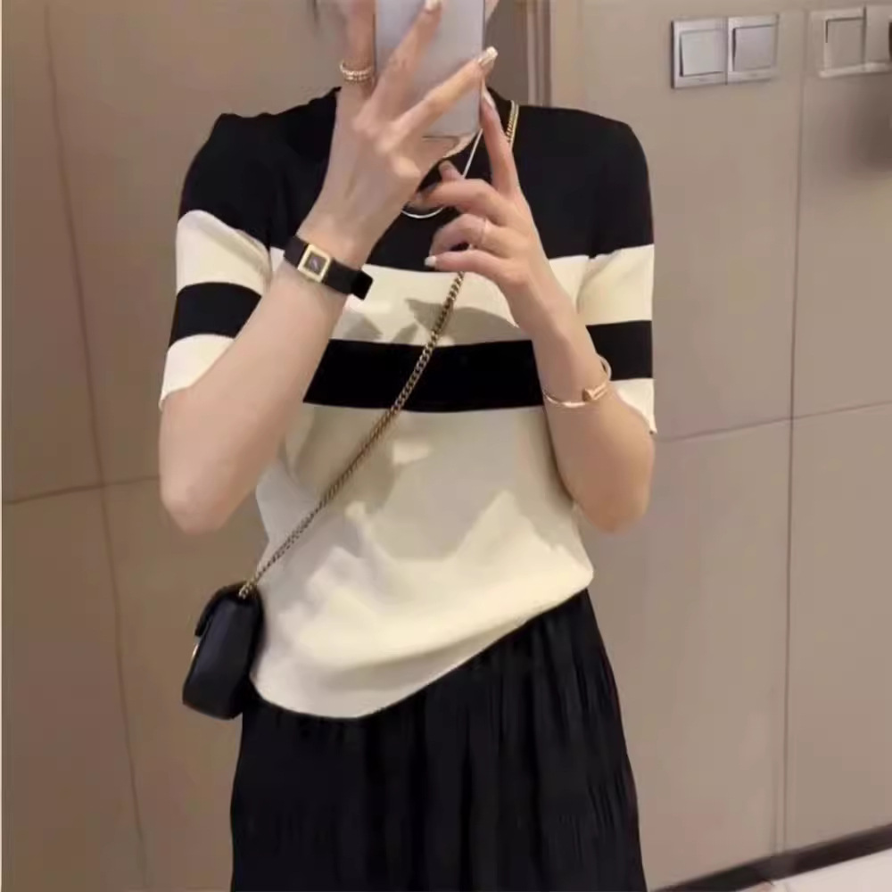 针织条纹短袖T恤女士夏季新款高级感撞色圆领内搭打底衫上衣