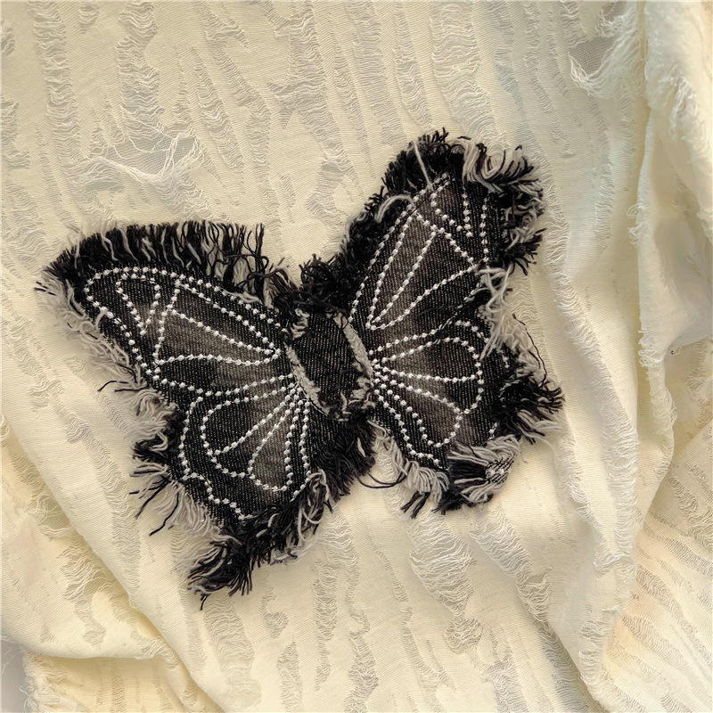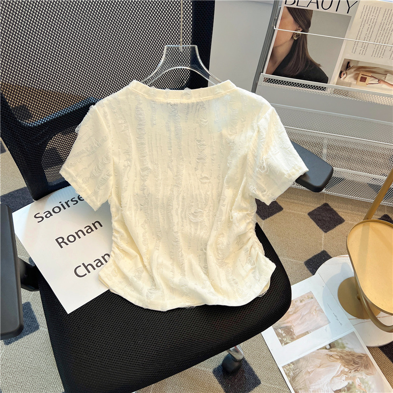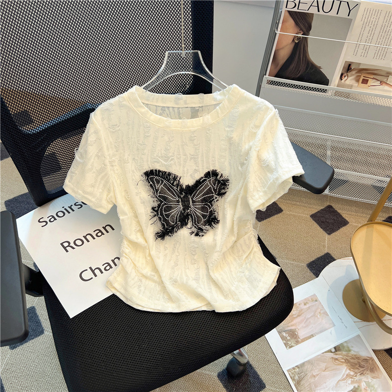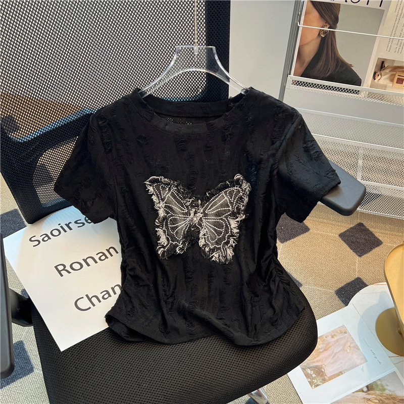美式蝴蝶贴布破洞短袖t恤女夏褶皱修身显瘦设计感独特别致小上衣