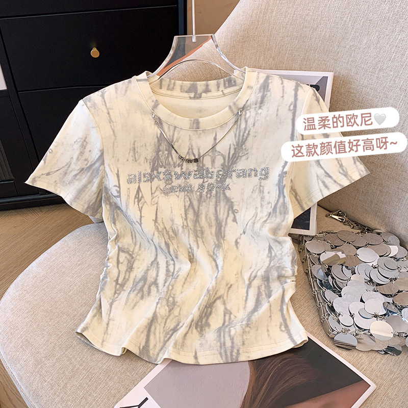 扎染烫钻短款t恤女短袖夏季设计感小众高腰修身小个子正肩上衣潮
