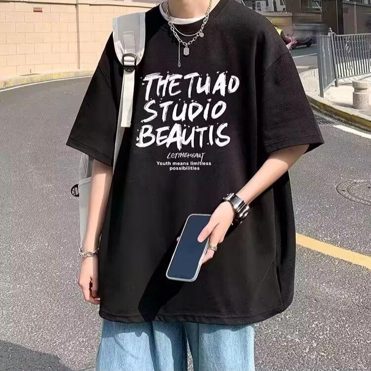 夏季ins潮男生T恤五分袖百搭外贸跨境青春流行潮牌风圆领半袖上衣