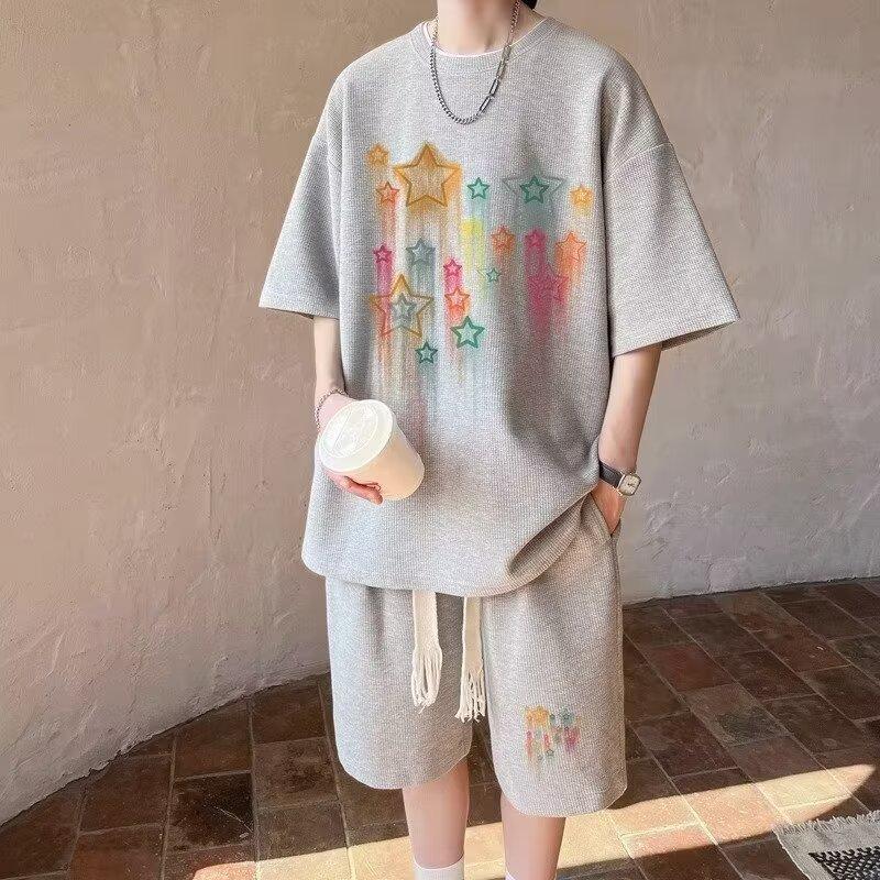 华夫格t恤男士夏天季套装潮牌涂鸦青少年冰丝短袖短裤休闲两件套