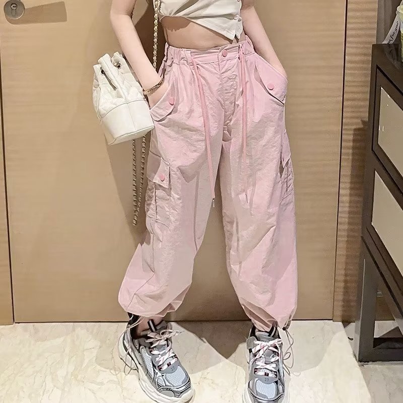 新款儿童宽松休闲多口袋工装裤女童美式休闲裤阔腿落伞裤跨境