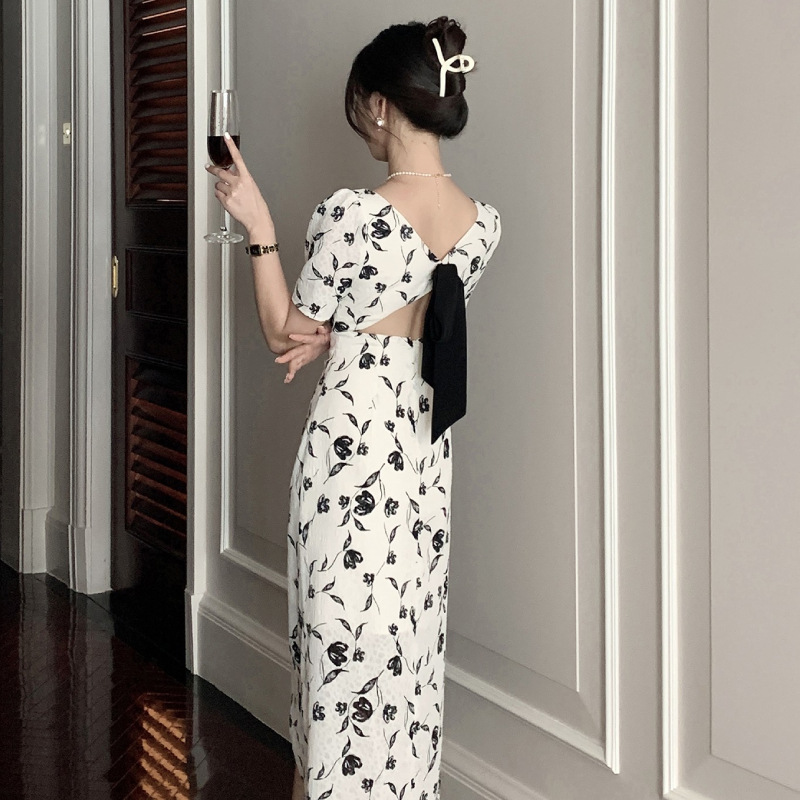 夏装新款法式复古纯欲碎花桔梗连衣裙女赫本风V领别致长裙子