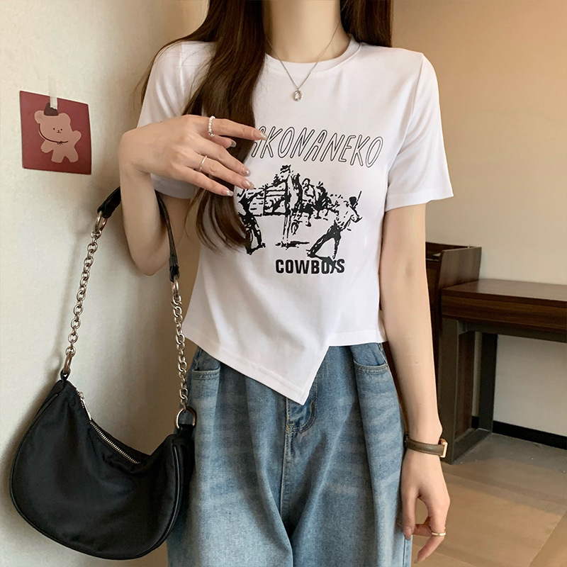 短袖t恤女ins潮夏装新款印花开叉独特别致设计感辣妹短款上衣