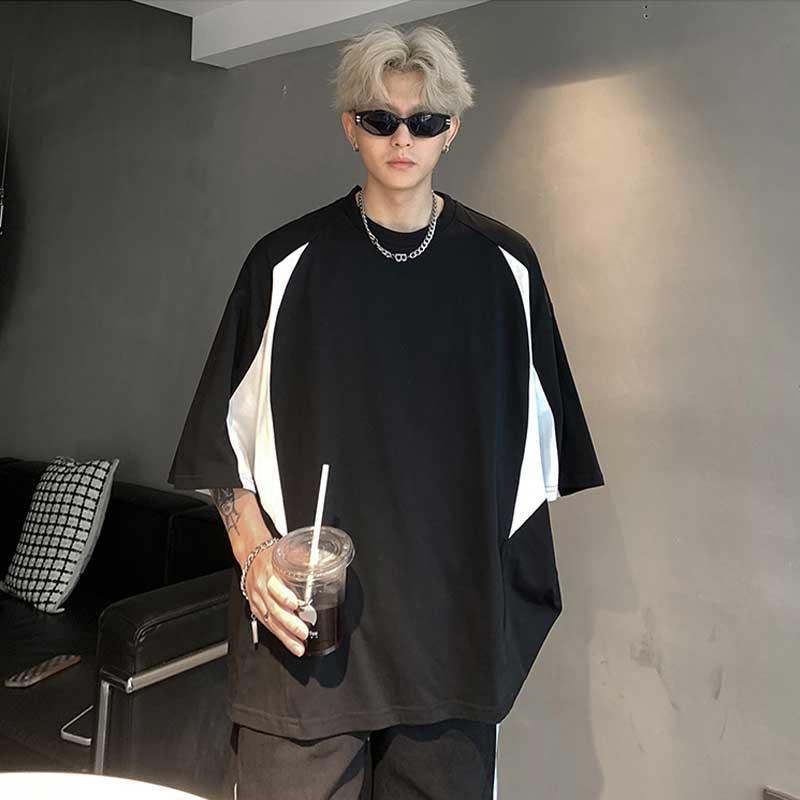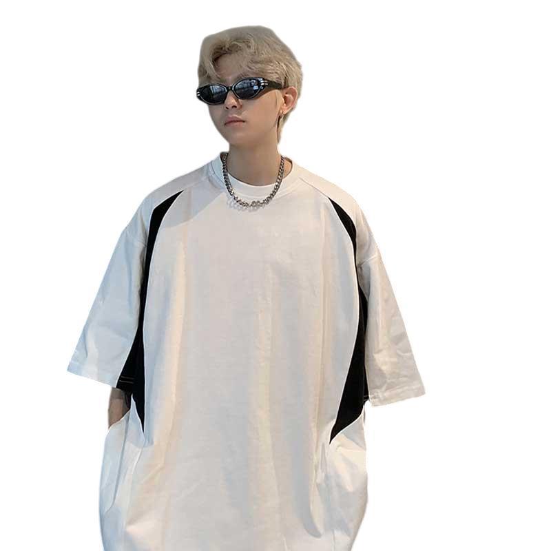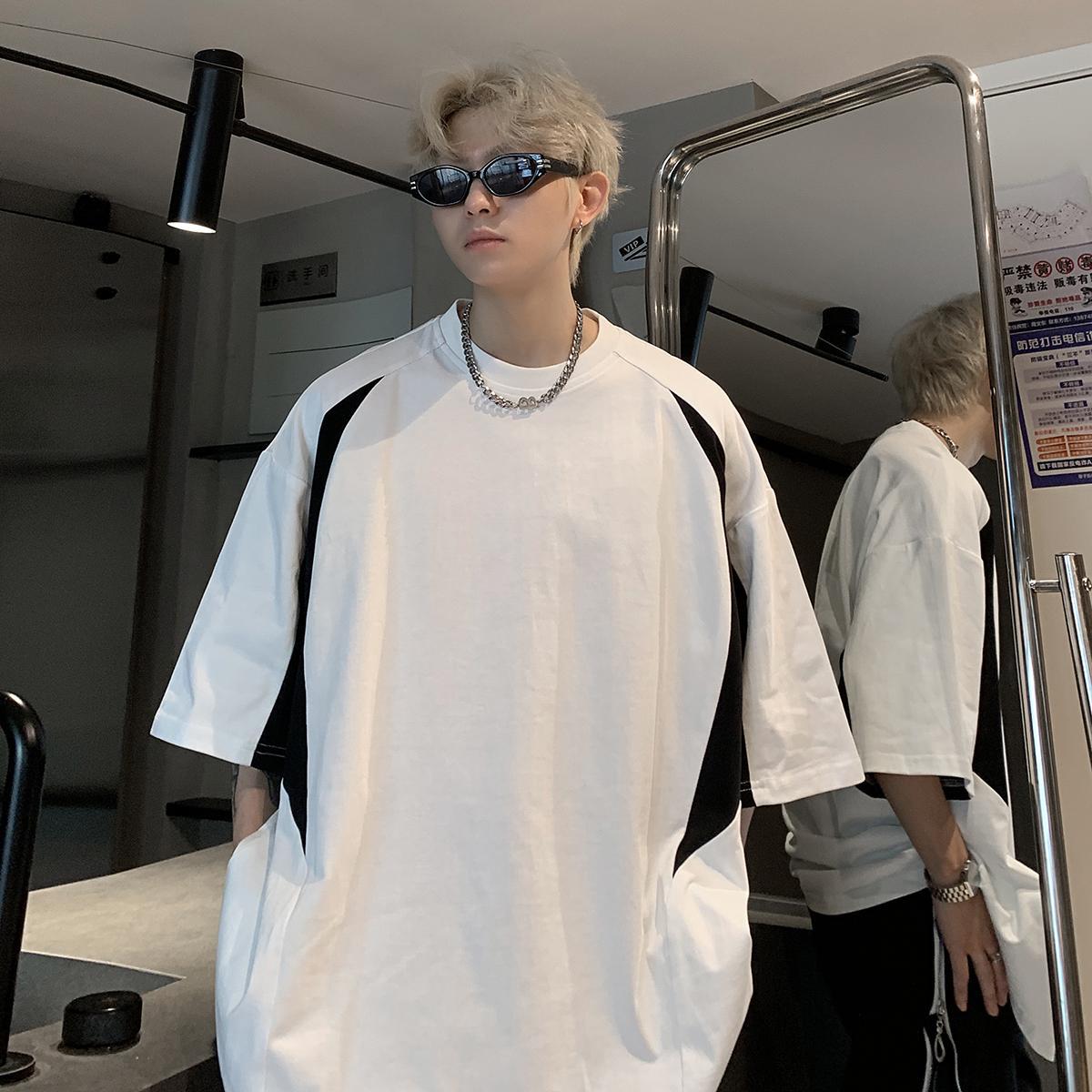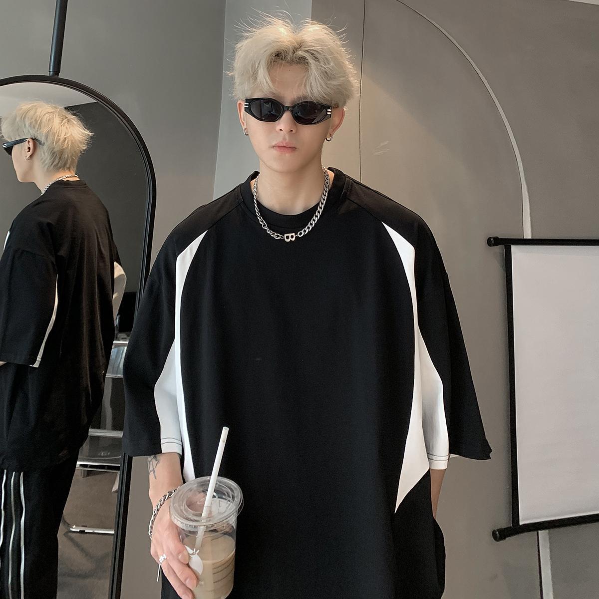 圆领短袖t恤男夏季美式复古百搭拼接撞色高级设计感痞帅休闲上衣