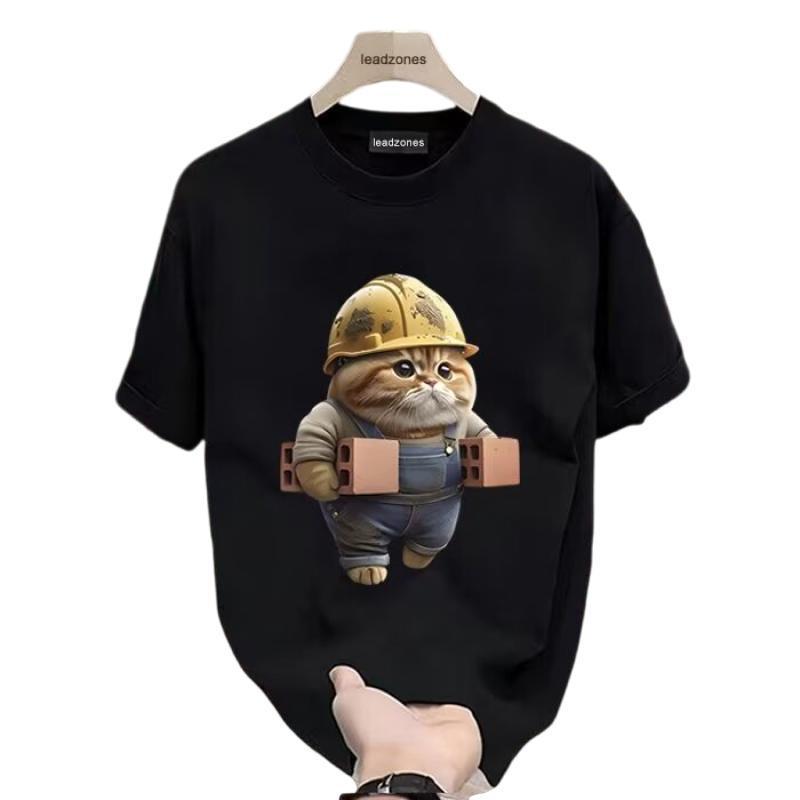 美式潮牌短袖T恤男生夏季新款趣味搬砖猫咪印花百搭时尚超火上衣