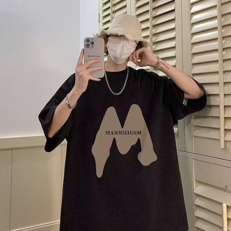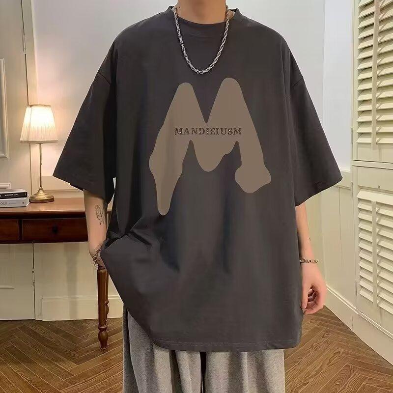 美式复古短袖t恤男生夏季新款纯棉字母印花五分袖圆领上衣服