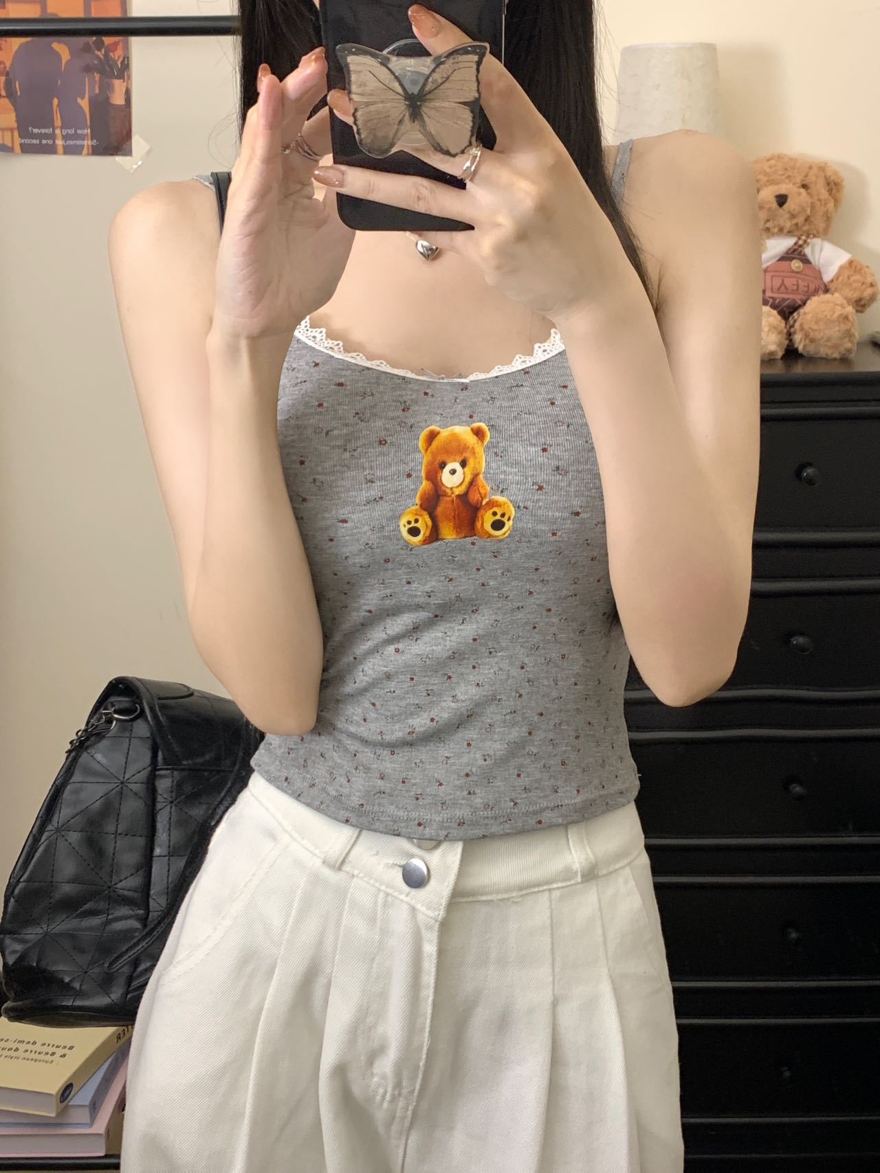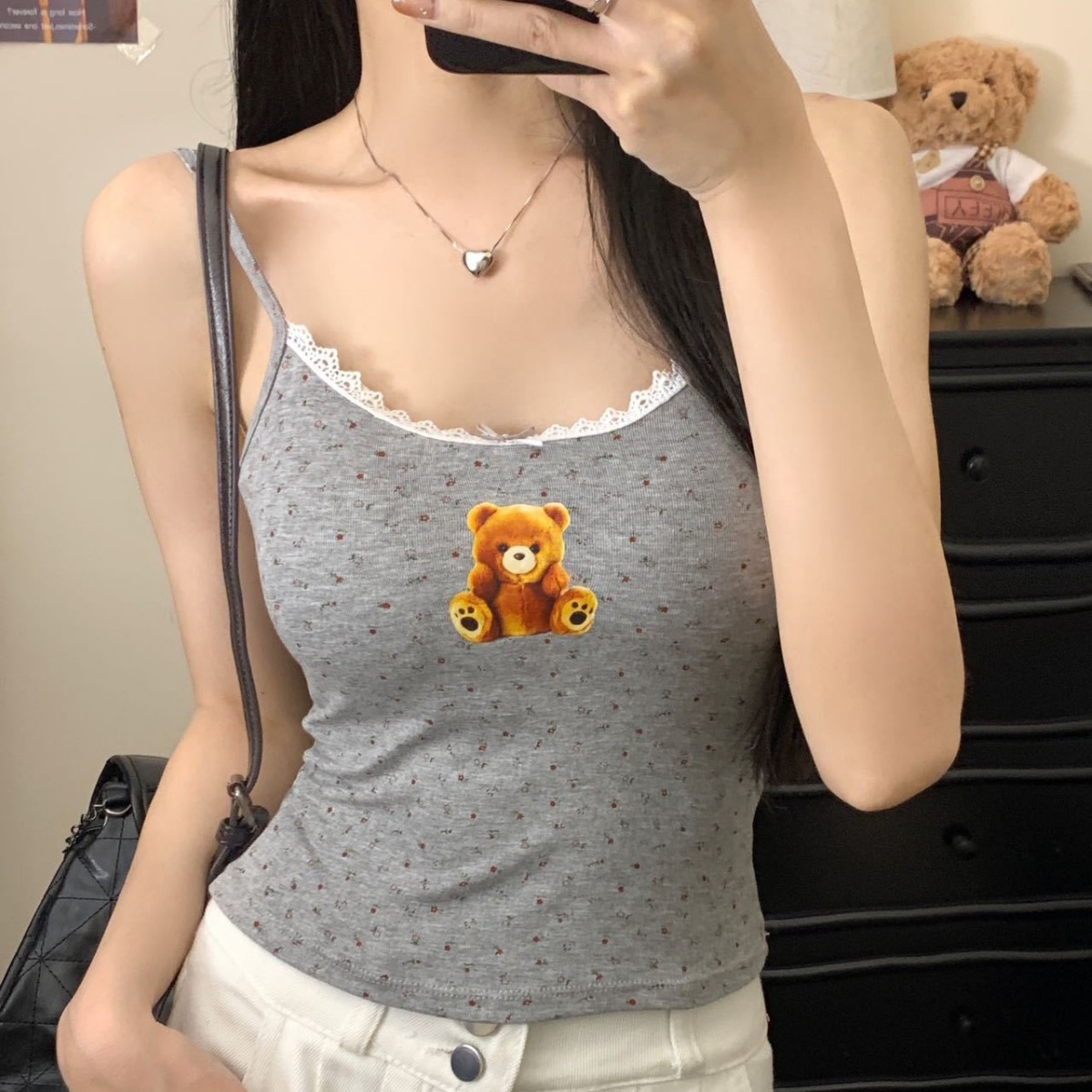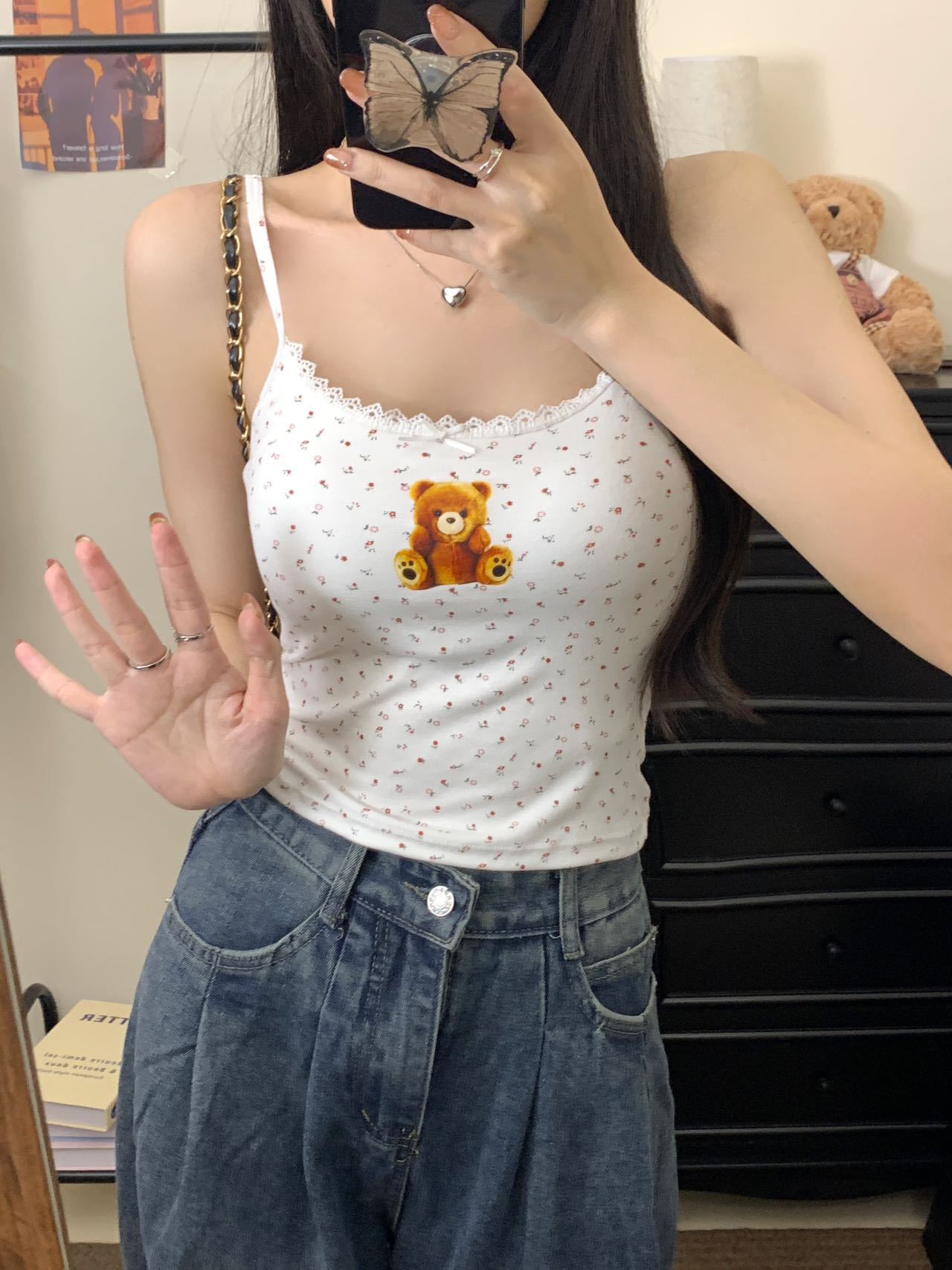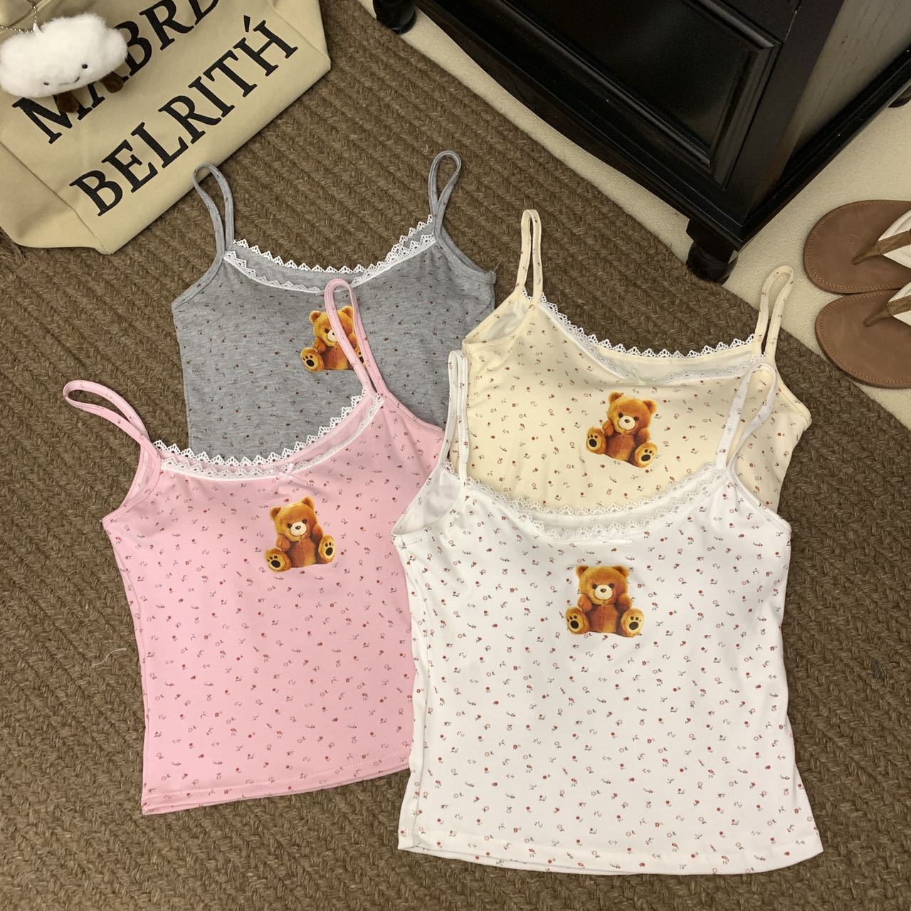 甜美碎花吊带背心女带胸垫小熊印花可爱纯欲风修身内搭美背上衣女