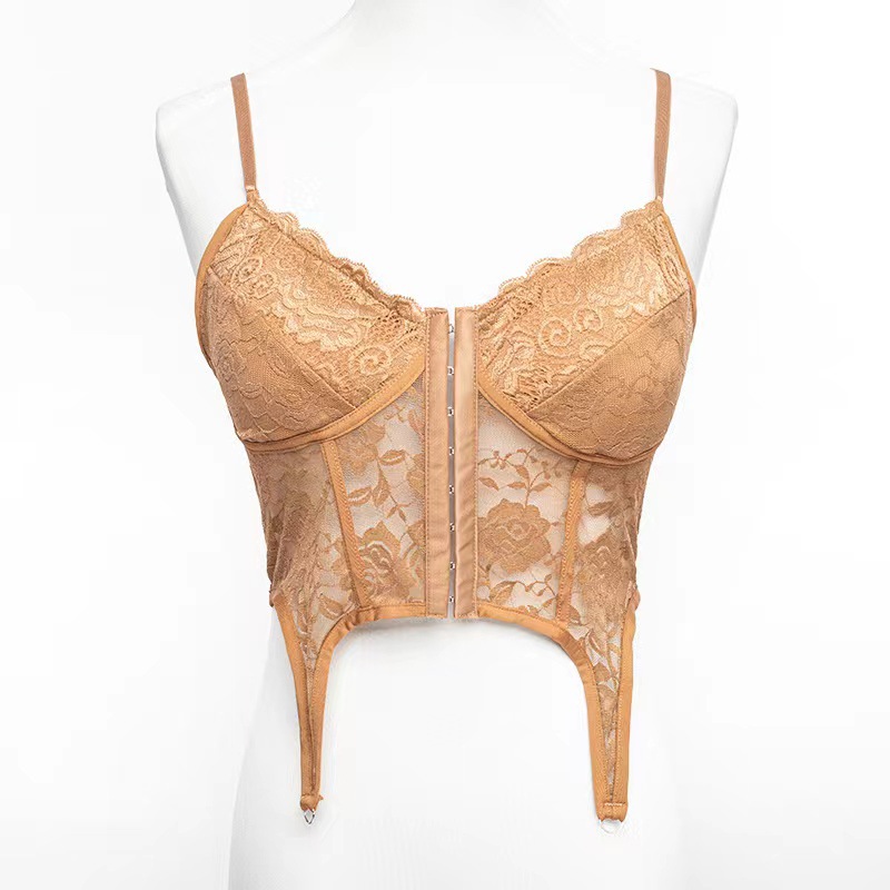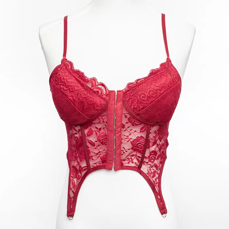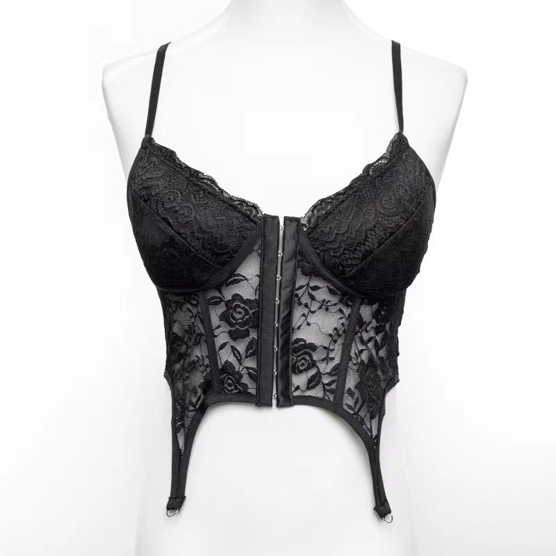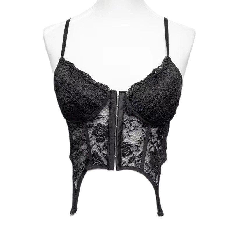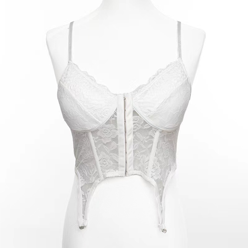 性感蕾丝钩花带胸垫内衣女内搭修身辣妹纯欲鱼骨排扣款美背女