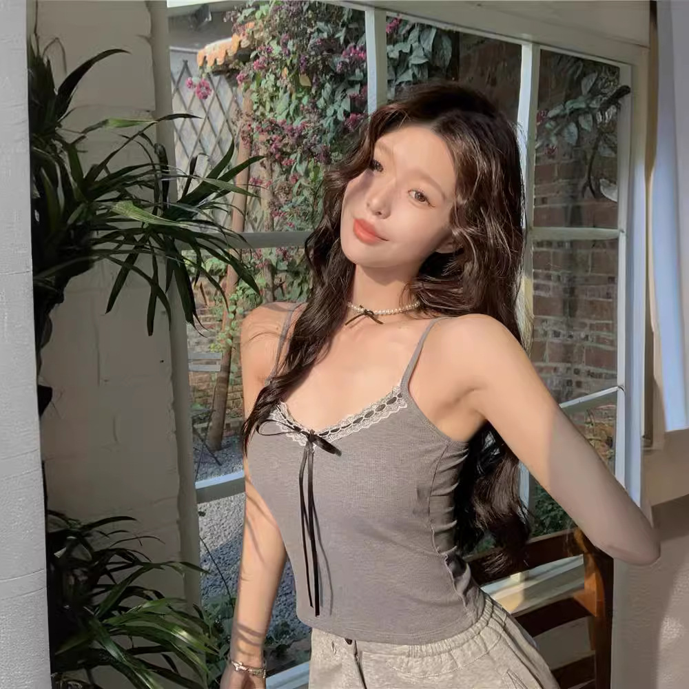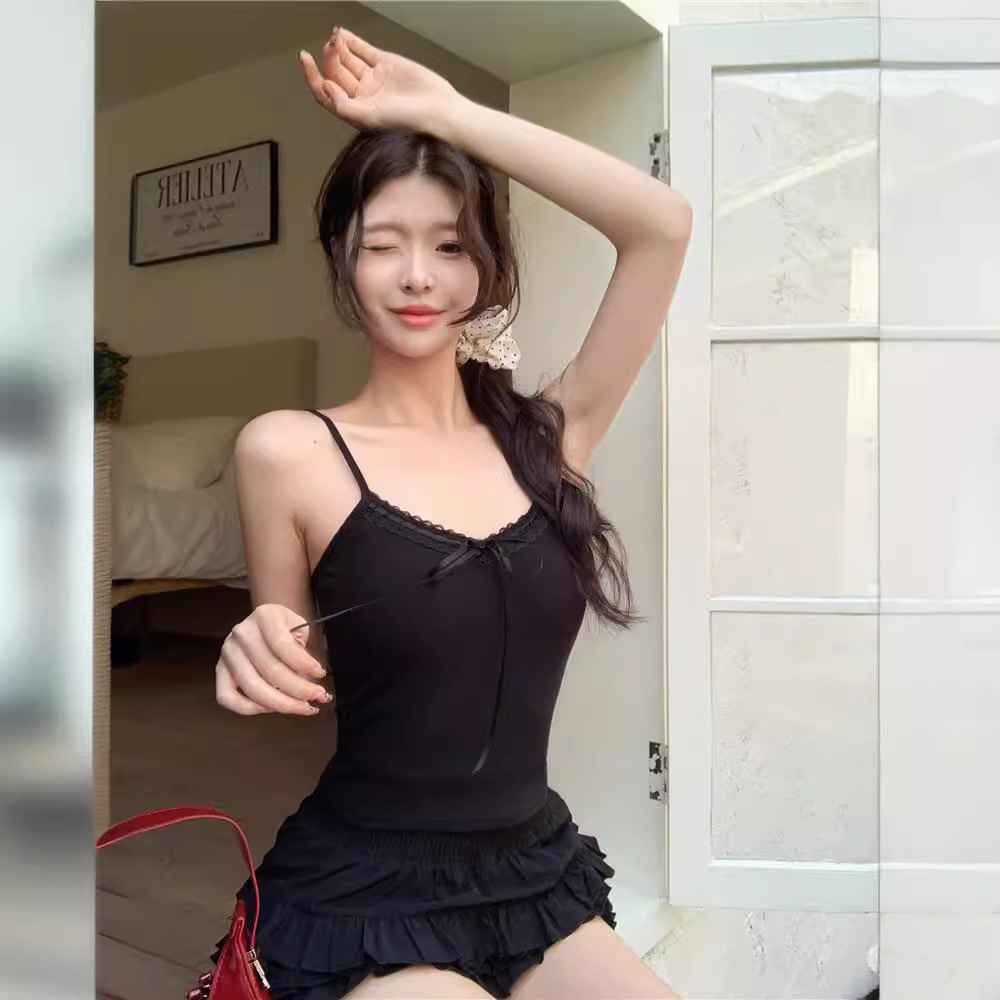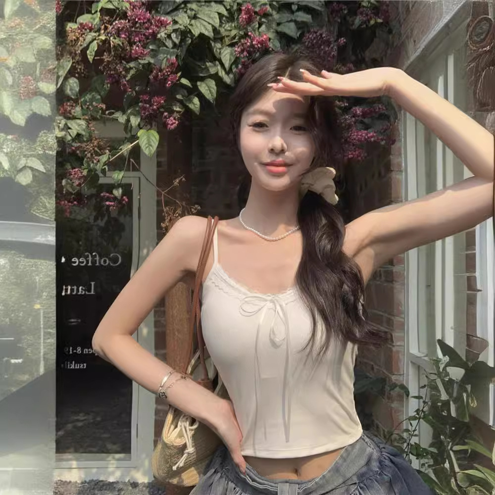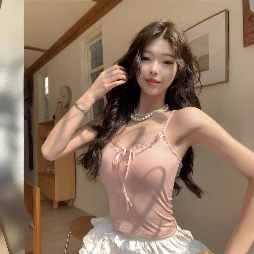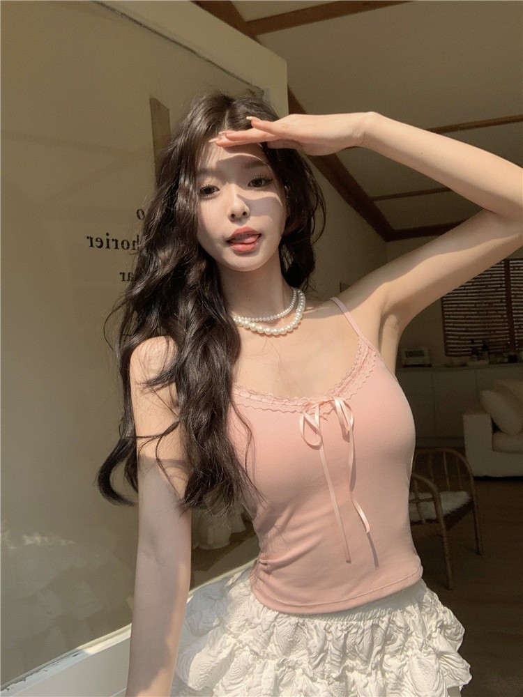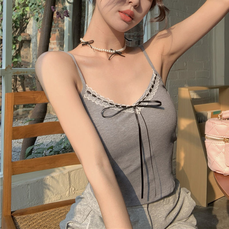 新款纯欲辣妹修身吊带背心女带胸垫蕾丝花边蝴蝶结系带美背上衣女