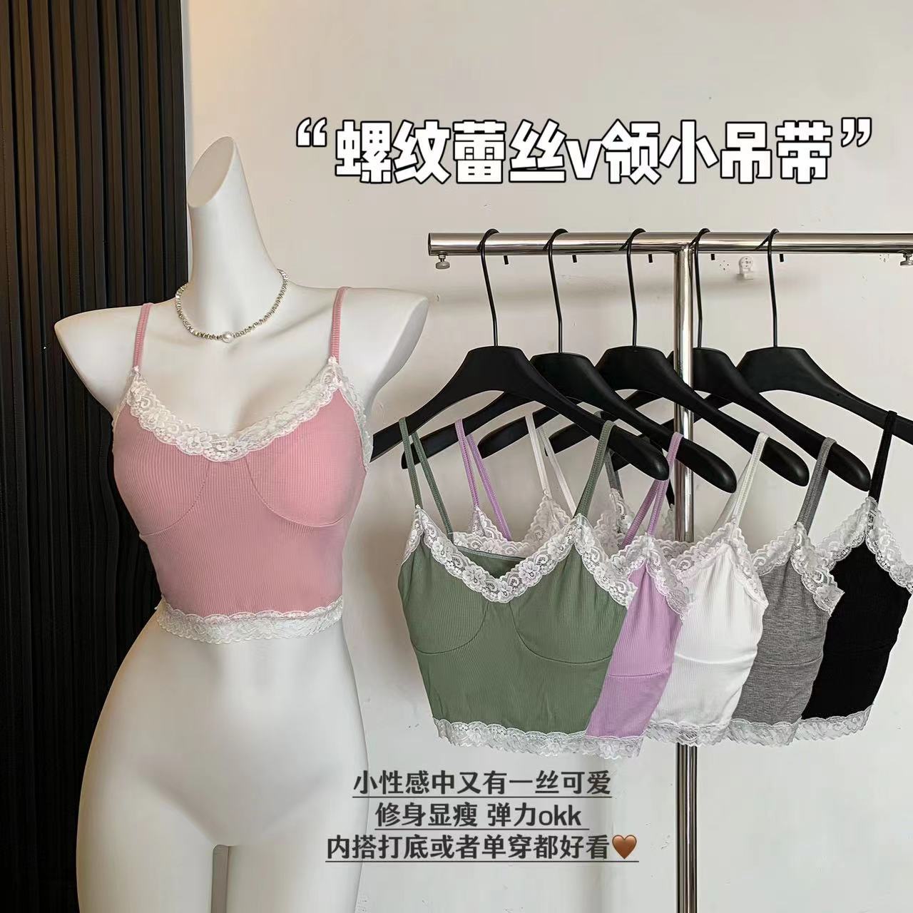 夏季新款蕾丝美背纯欲风带胸垫吊带背心女打底修身辣妹设计感上衣