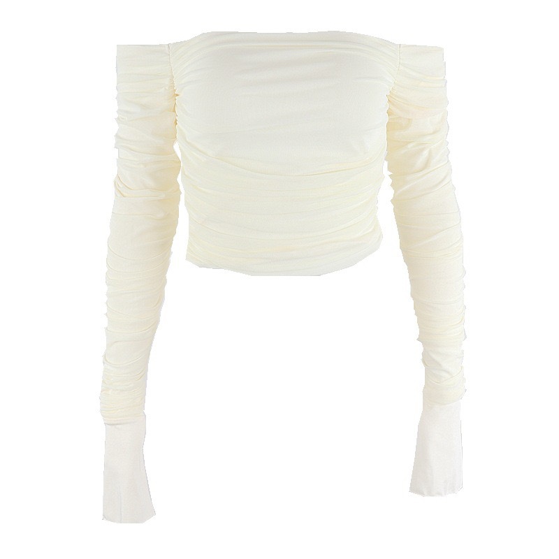 欧美风新款性感双层网纱上衣 甜美一字肩皱褶喇叭长袖T恤女