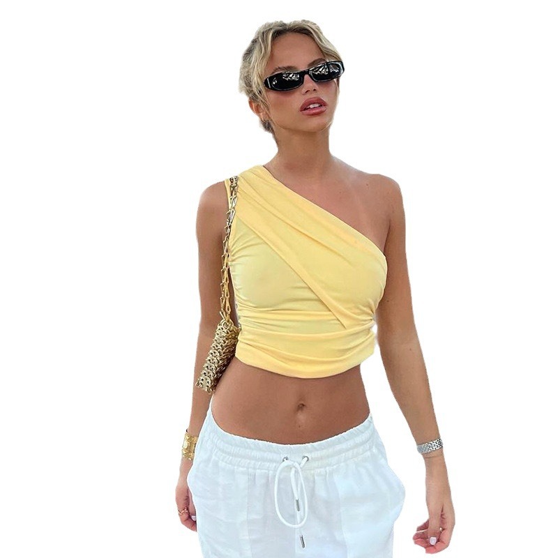 欧美风夏季新款时尚纯色露脐修身单肩设计感性感上衣女