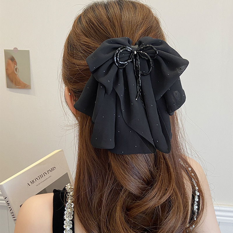 新款黑色满天星水钻流苏蝴蝶结半扎发高低马尾发夹鲨鱼夹子女