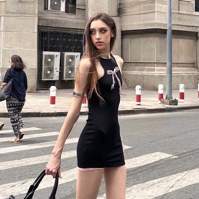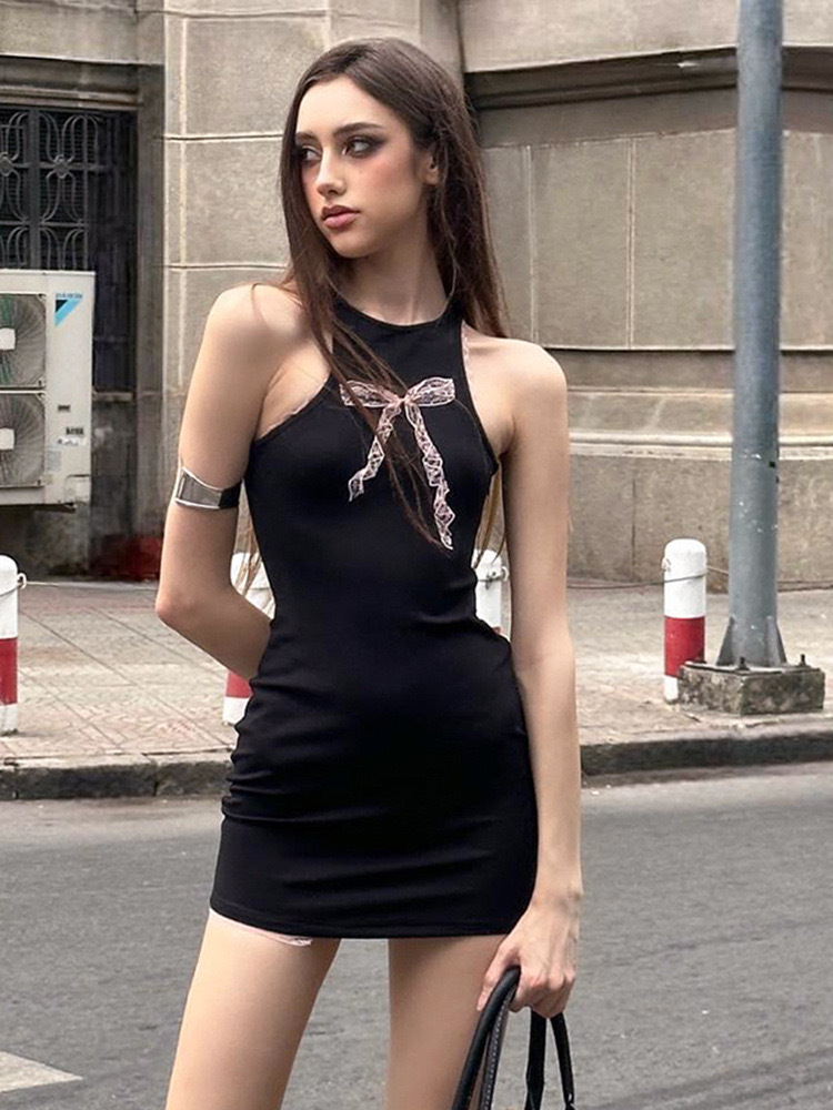 欧美风夏季新款性感蝶结圆领纯色一步裙蝴无袖连衣裙女