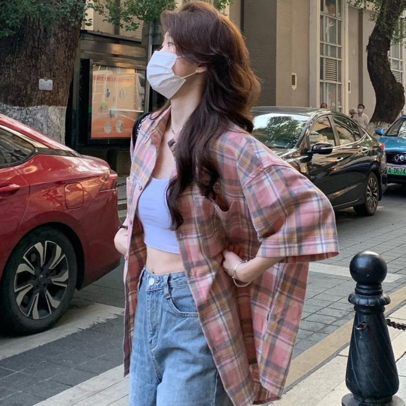 美式复古粉色格子衬衫女款夏季设计感小众小个子休闲短袖上衣
