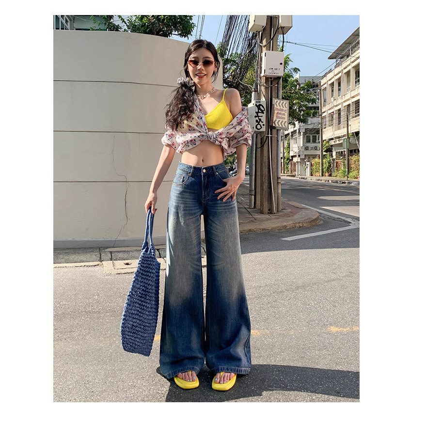 美式辣妹复古2025春夏新款阔腿高腰慵懒垂感直筒拖地牛仔裤子女
