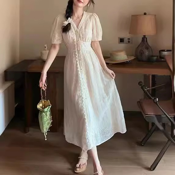 法式蕾丝白色连衣裙女夏季新款温柔风高级感显瘦坠感v领长裙