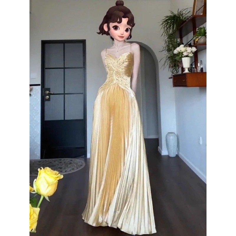 金色褶皱连衣裙吊带百褶新款名媛时尚优雅大气高端轻奢