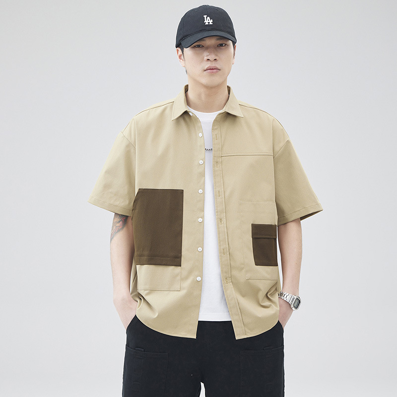 优质衬衫男短袖夏季日系潮牌拼接设计感休闲翻领外套新款工装半袖