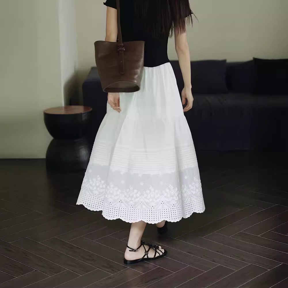重工法式白色花边长裙a字夏季新款全棉打褶半身裙女设计感