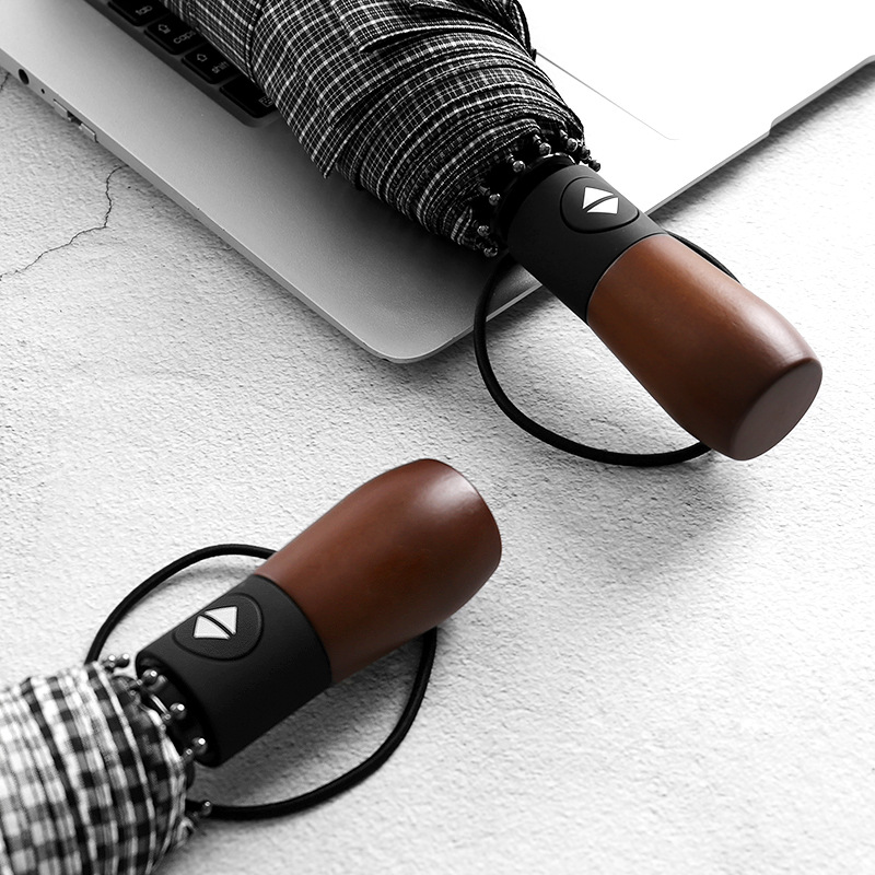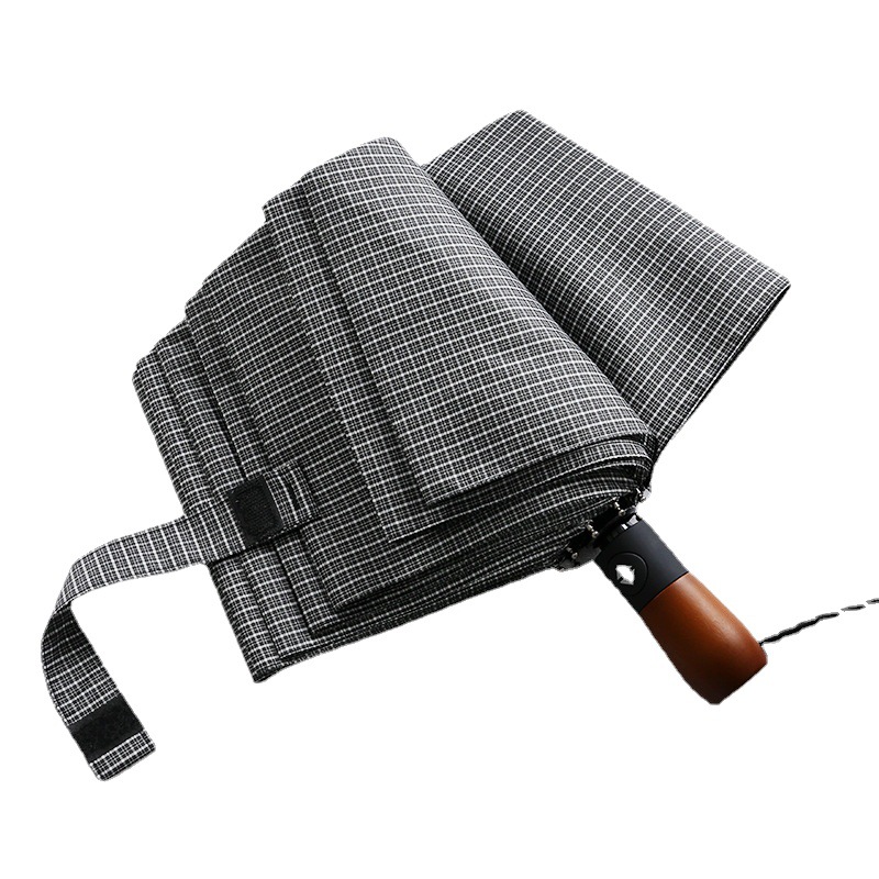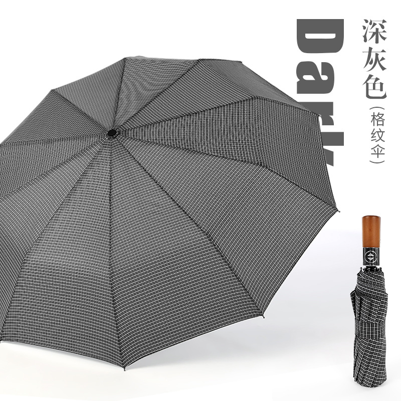 格纹三折全自动晴雨伞十骨防风雨伞折叠伞男商务实木雨伞