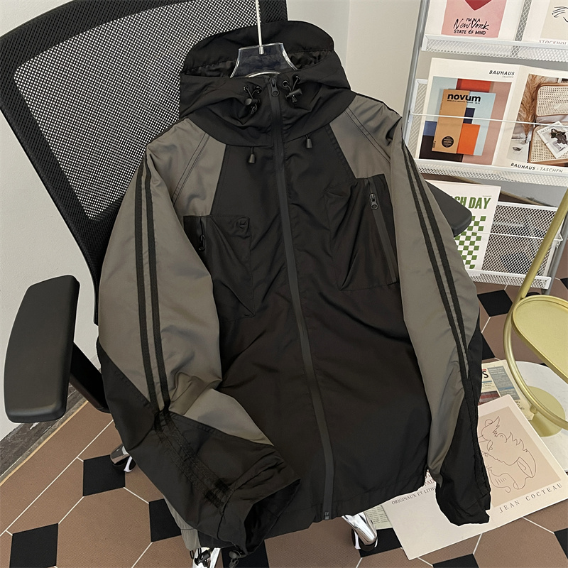 机能风拼接插肩连帽冲锋衣男女户外运动休闲工装外套夹克衫春秋季