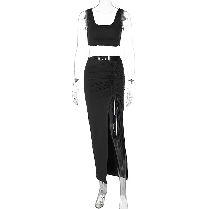 欧美风夏秋季U领抹胸修身开叉长裙时尚休闲两件套