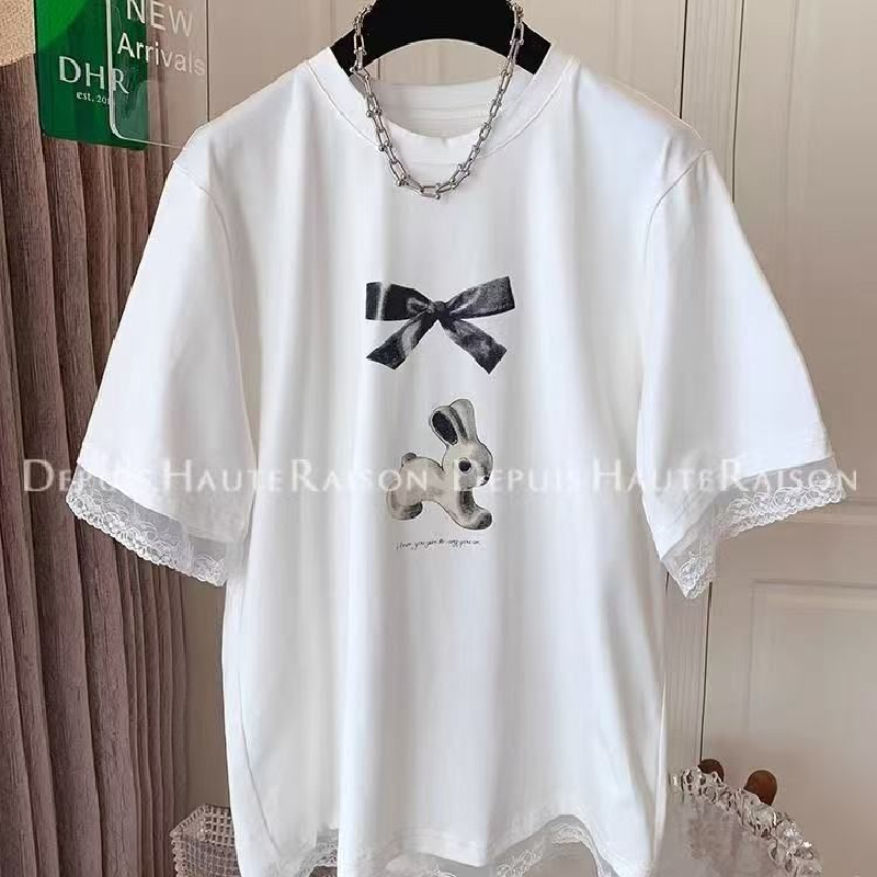 新款设计感蕾丝拼接蝴蝶结兔子印花短袖T恤女宽松显瘦打底衫上衣