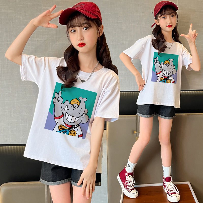 实拍女童夏装短袖T恤新款宽松休闲卡通印花儿童女孩夏季服大童潮