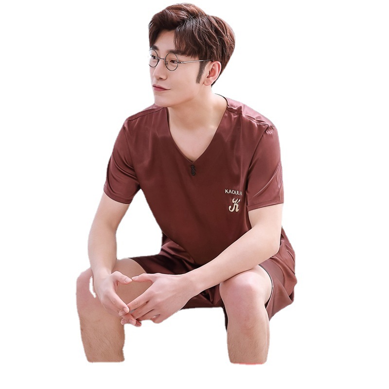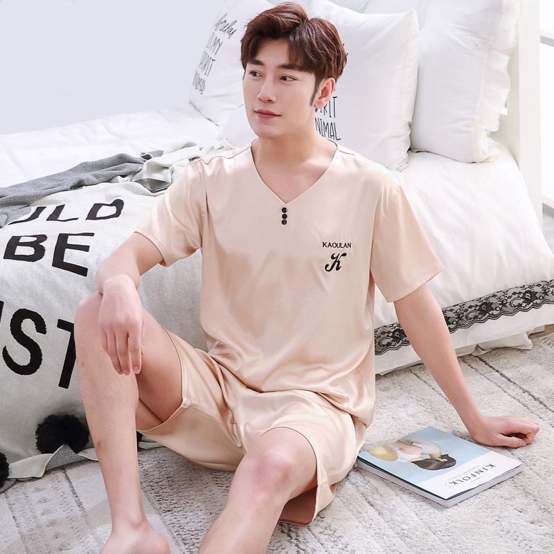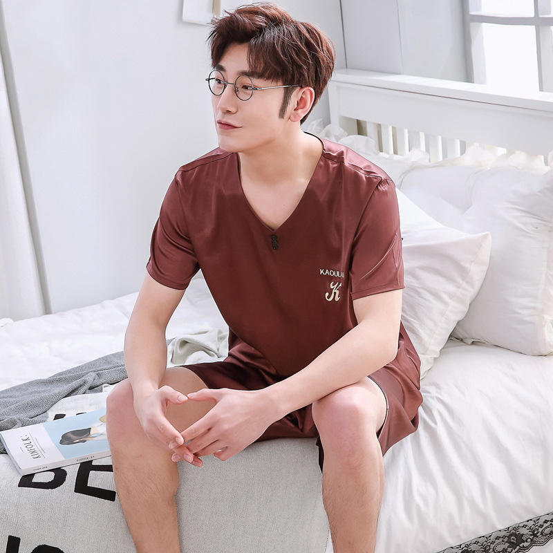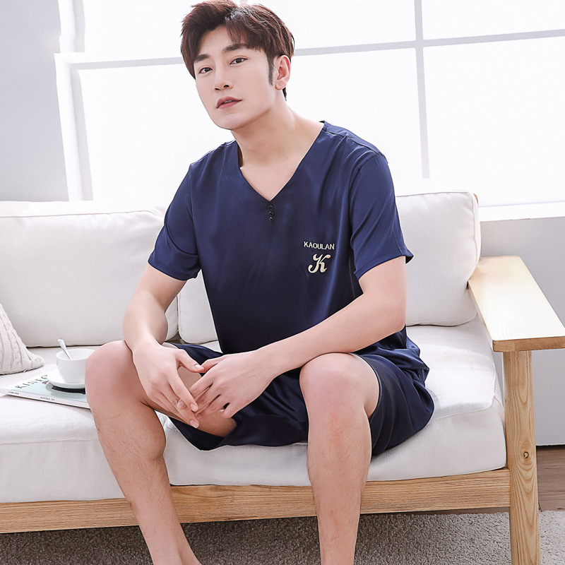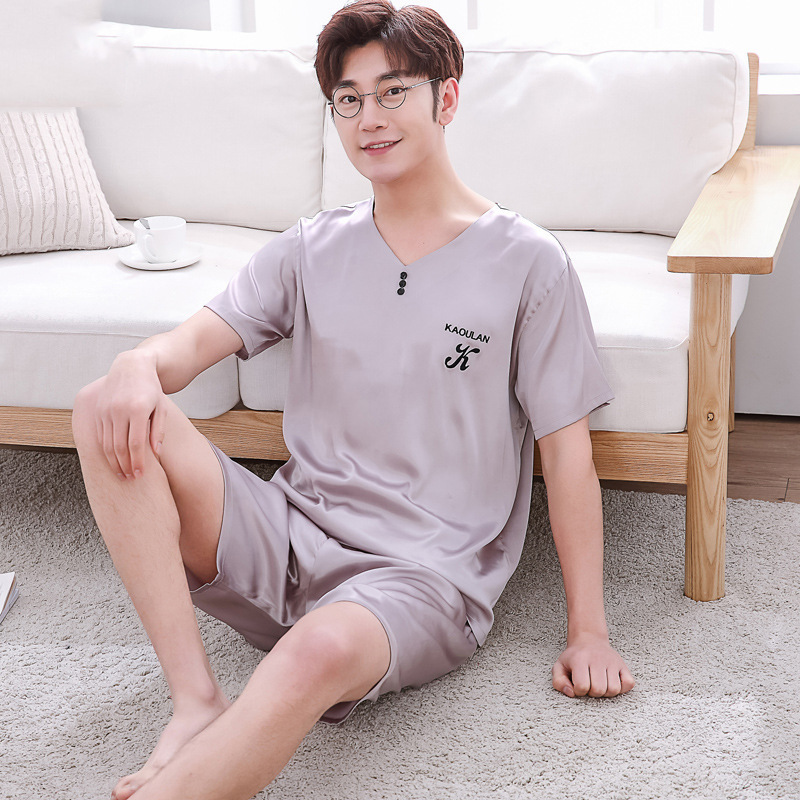 新款韩版冰丝睡衣男夏季短袖短裤套头睡衣仿真丝男士大码家居服