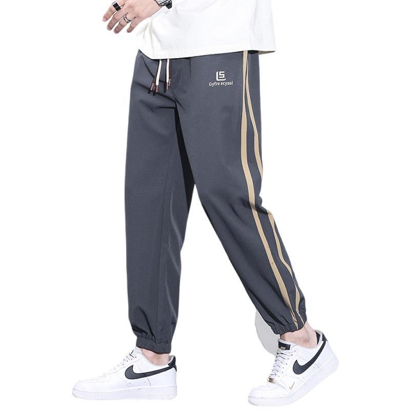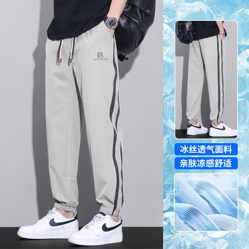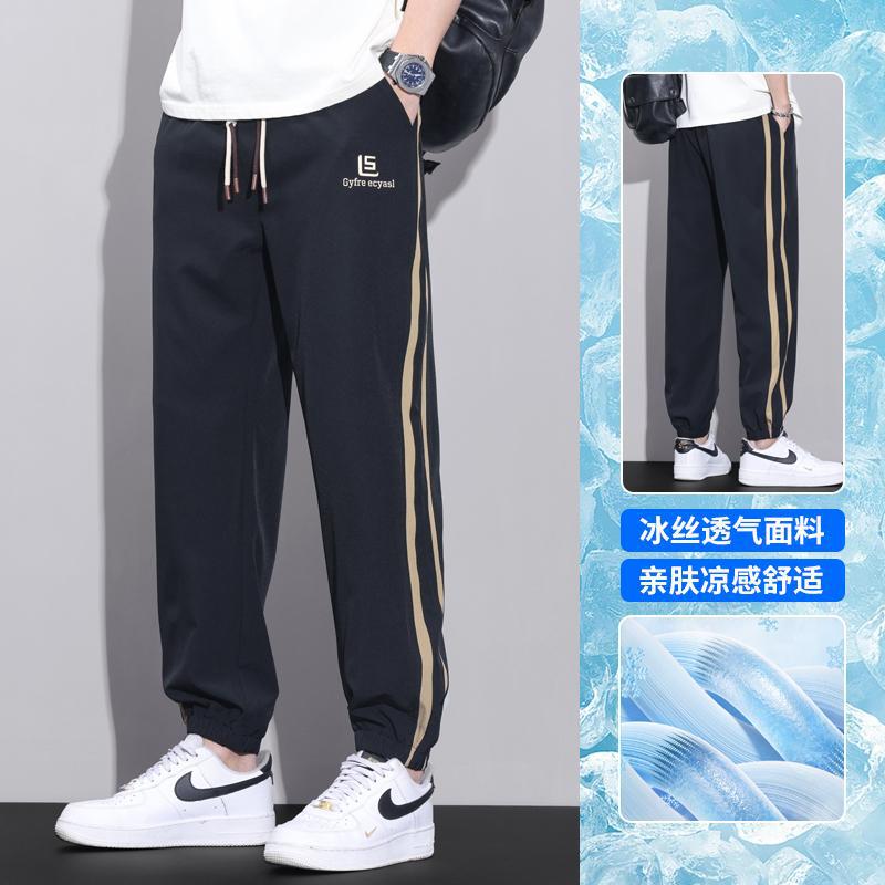 港风冰丝裤子男士夏季新款宽松百搭九分裤侧边条纹运动休闲束脚裤
