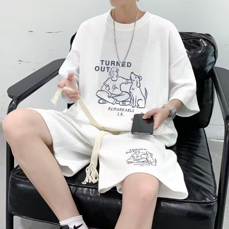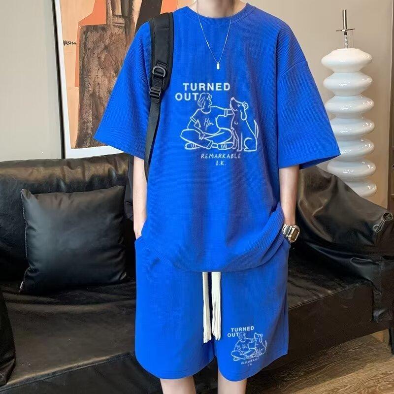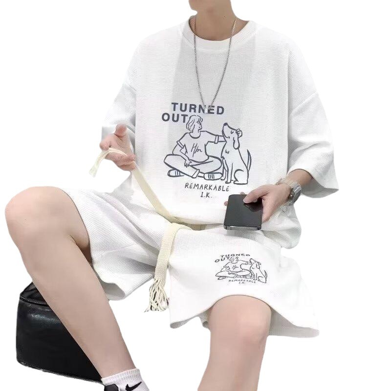 华夫格休闲运动套装男宽松夏季短袖t恤男装一套搭配帅气短裤衣服