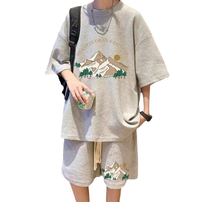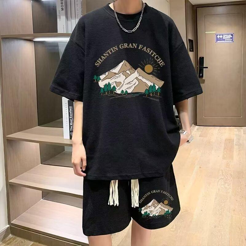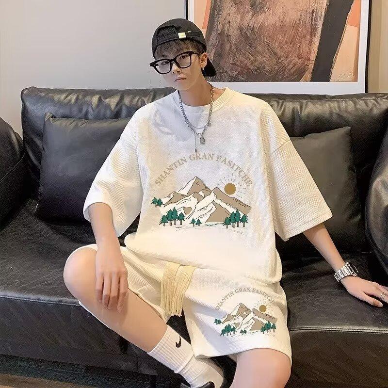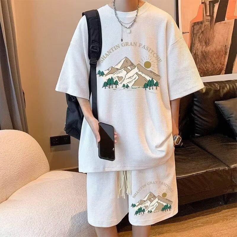 华夫格运动套装男士夏季休闲宽松T恤短裤两件套大码胖仔一套穿搭