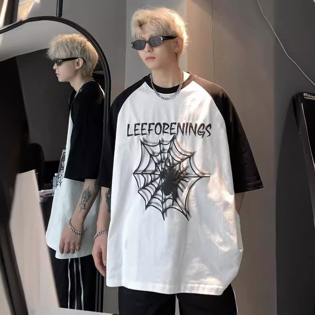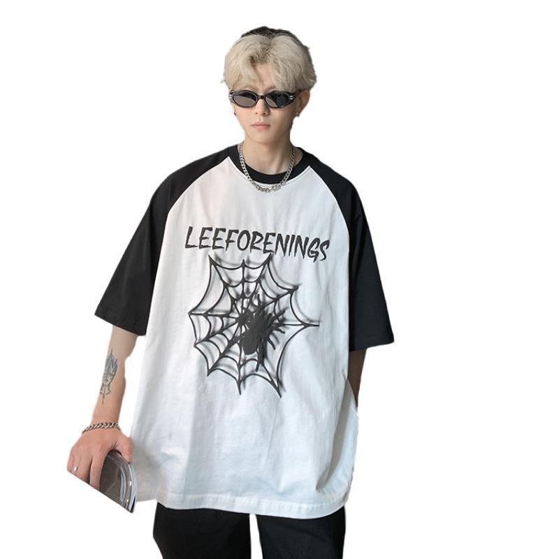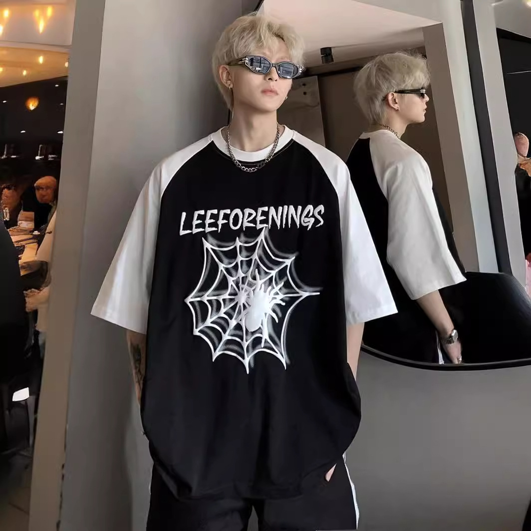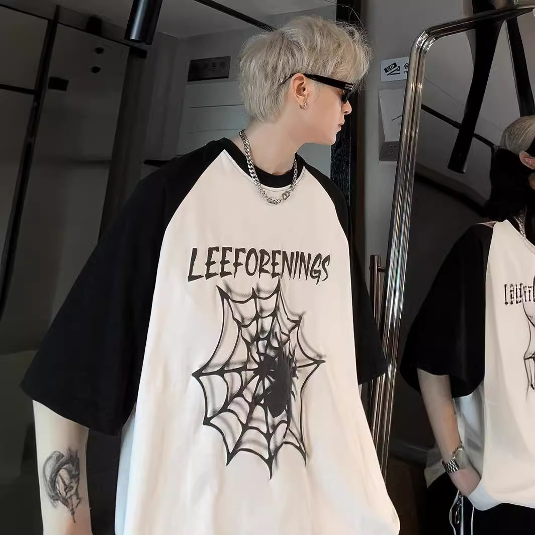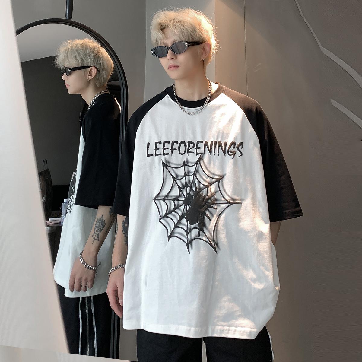 蜘蛛网印花短袖t男夏季美式撞色拼接高级设计感宽松情侣圆领上衣