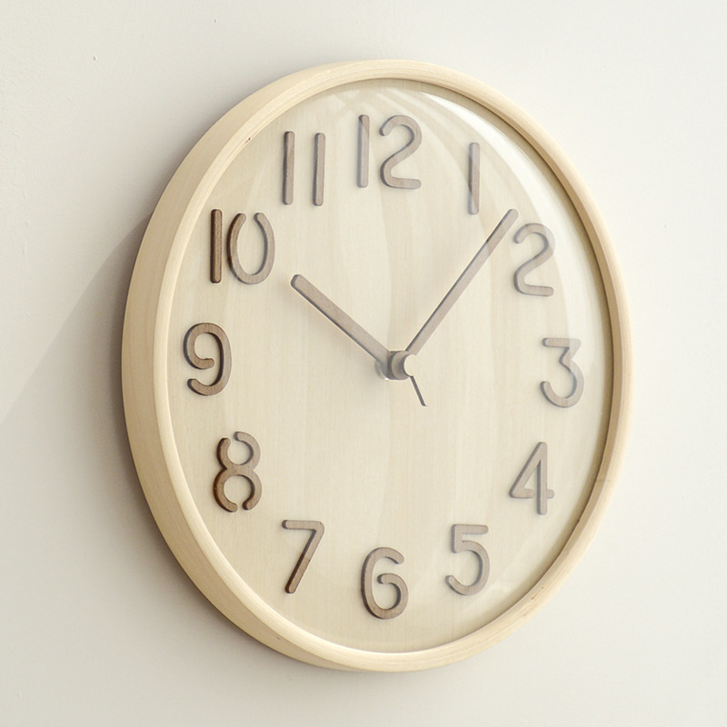 日式实木静音挂钟卧室挂墙装饰钟表3D立体客厅原木时钟创意圆形