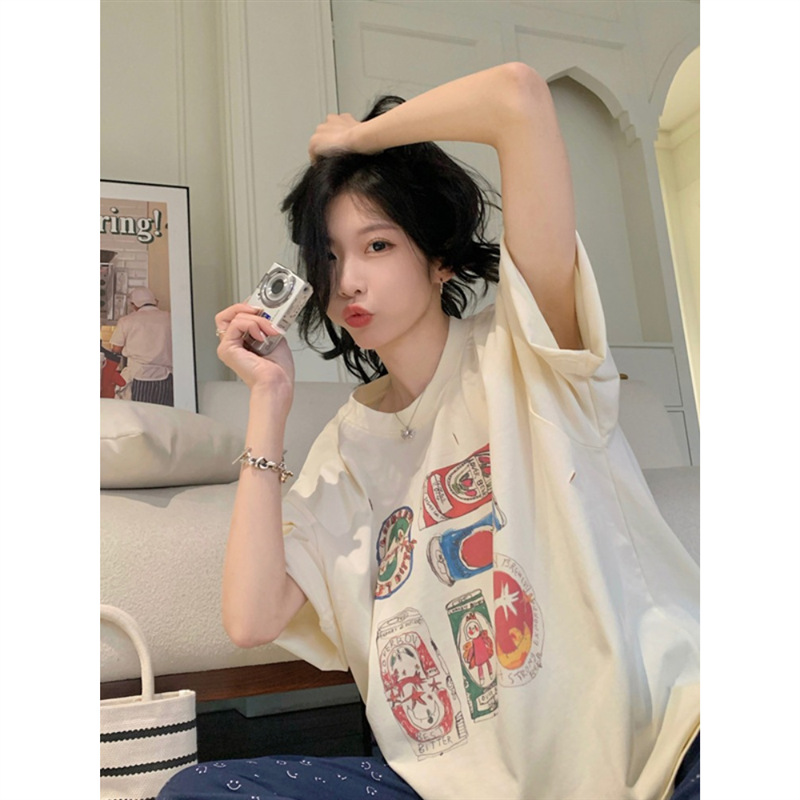 韩系印花短袖t恤女宽松显瘦慵懒风中长款设计感夏季上衣新款