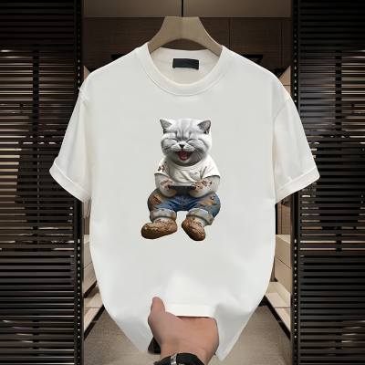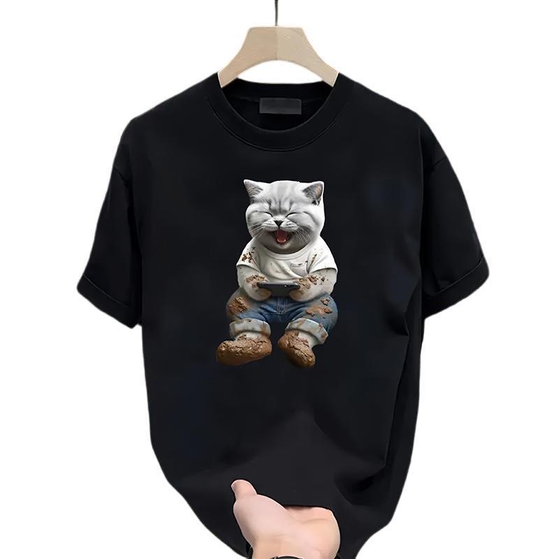 美式潮牌夏季新款趣味猫咪印花短袖T恤男生百搭超火时尚圆领上衣