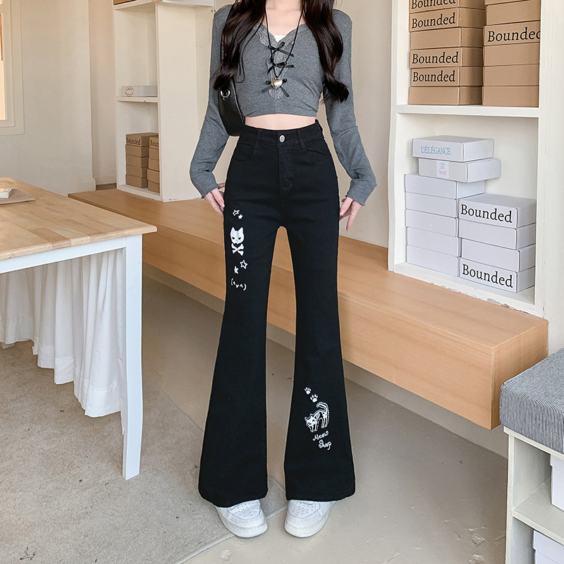实拍实价~设计感骷髅猫印花微喇牛仔裤女新款高腰显瘦阔腿长裤子