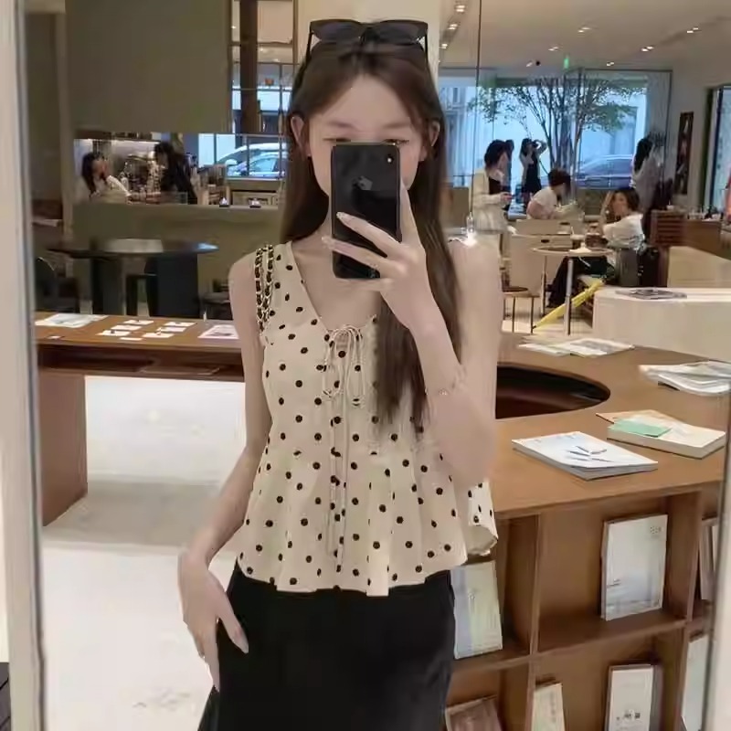 法式V领波点无袖衬衫女夏季独特别致娃娃衫独特别致显瘦背心上衣