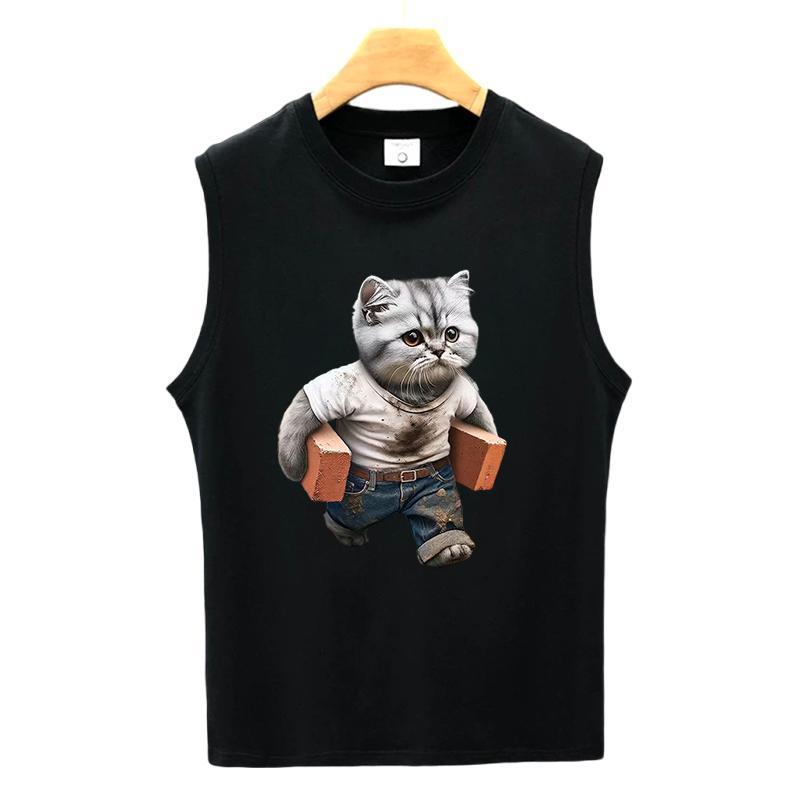 潮牌无袖t恤男士纯棉背心猫咪印花宽松夏季新款篮球运动坎肩上衣