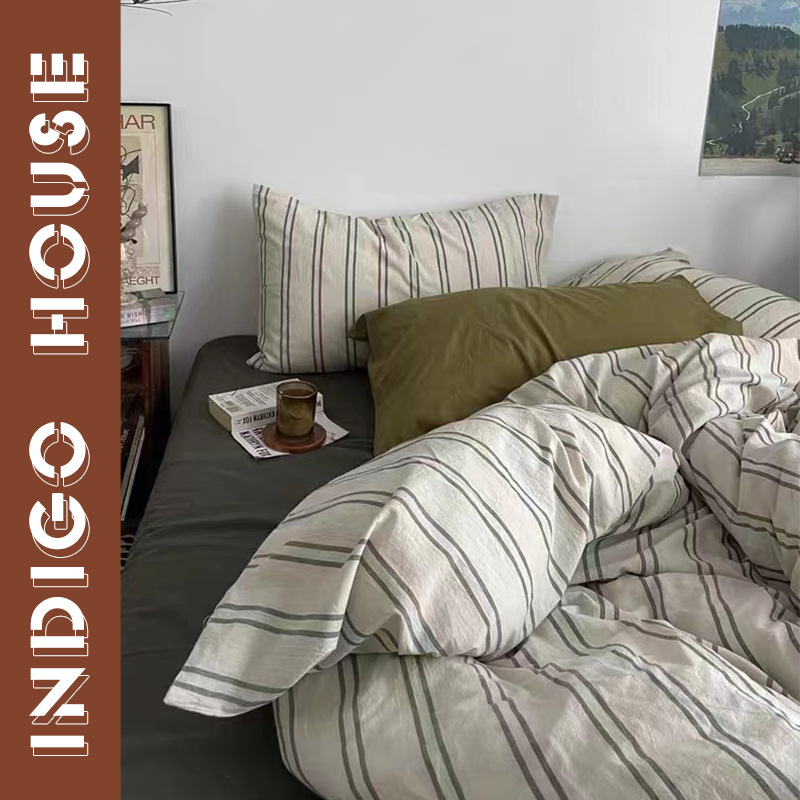 vintage中古风简约条纹全棉四件套ins风色织中性风复古条纹水洗棉