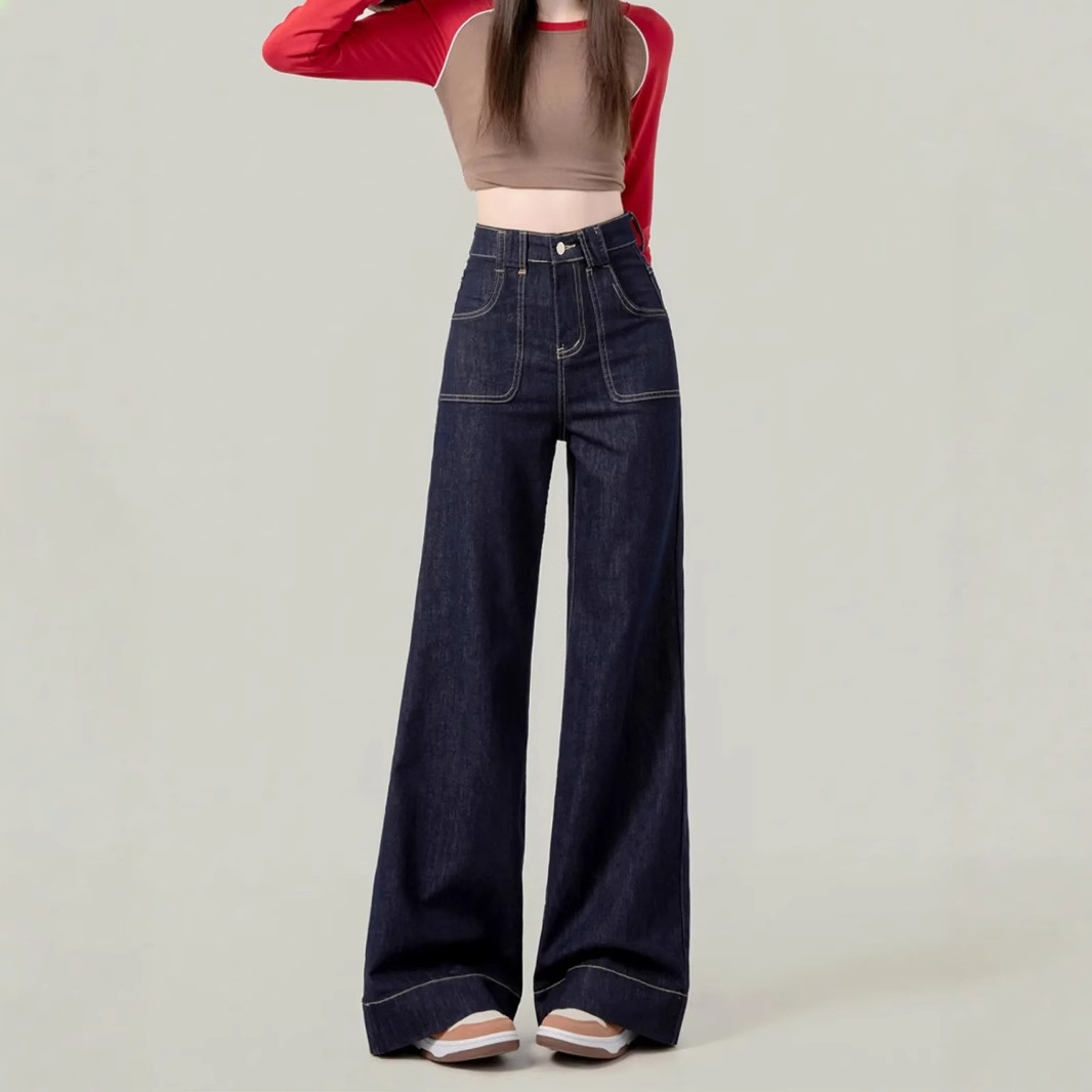 深蓝个性微喇牛仔裤夏天2025年新款高腰显瘦显腿长垂感百搭阔腿