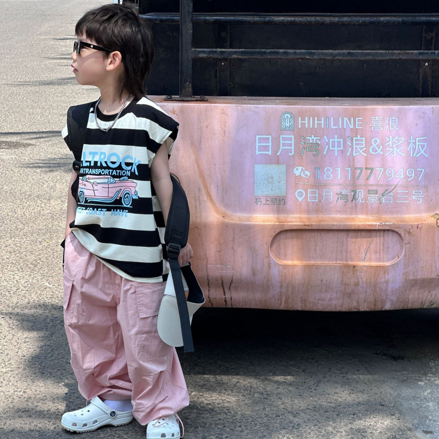 泰如夏季新款韩版男童字母拼色条纹无袖T恤儿童百搭上衣潮