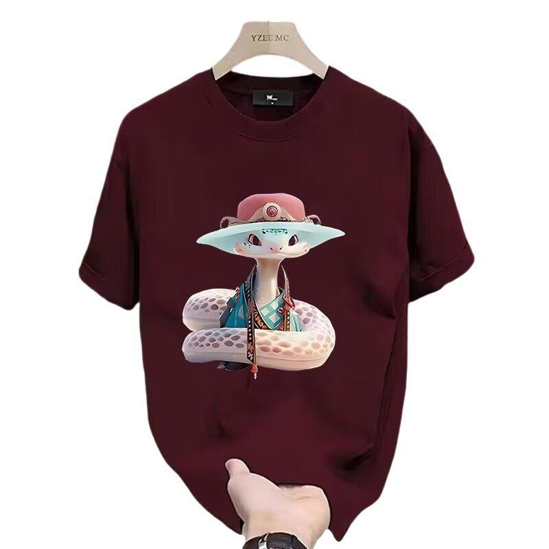 酒红色兔子正肩t恤女短袖夏小众设计感宽松新年本命年半袖上衣服