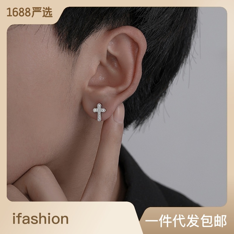 镶钻十字架耳钉男高级感痞帅纯银男士耳环潮男美式单只男生耳饰女